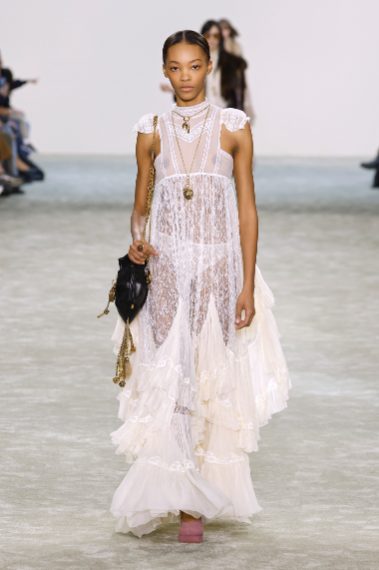 Abiti in seta e modelli in pizzo, dettagli in pelliccia, ruche e volant sfilano alla Paris Fashion Week sulla passerella Autunno/Inverno 2025-2026 di Chloé