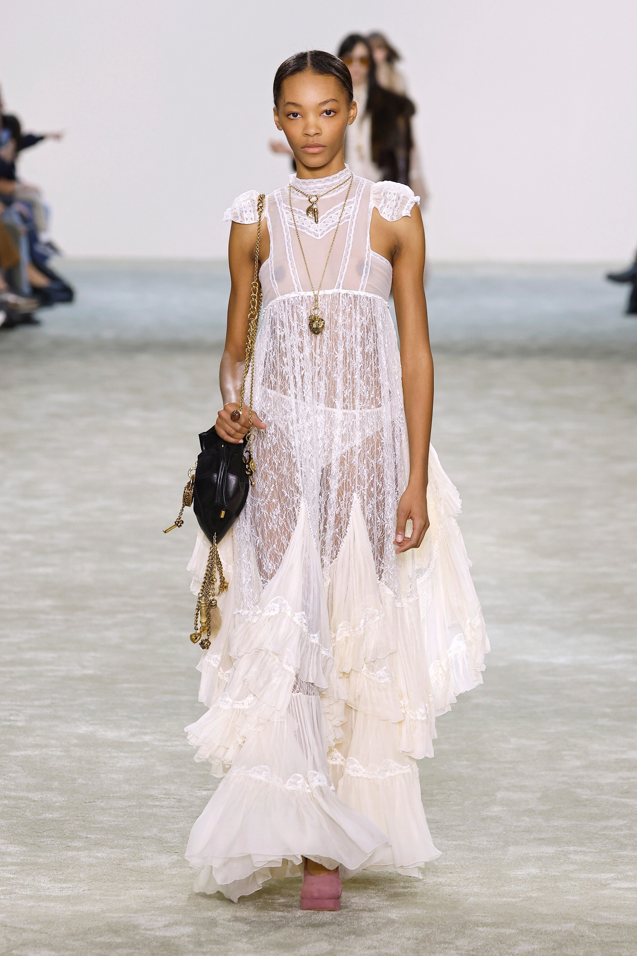 Abiti in seta e modelli in pizzo, dettagli in pelliccia, ruche e volant sfilano alla Paris Fashion Week sulla passerella Autunno/Inverno 2025-2026 di Chloé