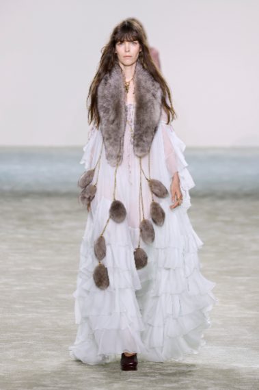 Abiti in seta e modelli in pizzo, dettagli in pelliccia, ruche e volant sfilano alla Paris Fashion Week sulla passerella Autunno/Inverno 2025-2026 di Chloé