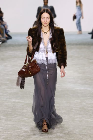 Abiti in seta e modelli in pizzo, dettagli in pelliccia, ruche e volant sfilano alla Paris Fashion Week sulla passerella Autunno/Inverno 2025-2026 di Chloé