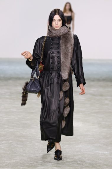 Abiti in seta e modelli in pizzo, dettagli in pelliccia, ruche e volant sfilano alla Paris Fashion Week sulla passerella Autunno/Inverno 2025-2026 di Chloé