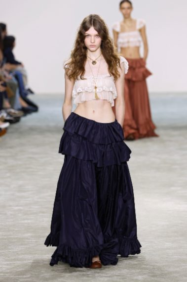 Abiti in seta e modelli in pizzo, dettagli in pelliccia, ruche e volant sfilano alla Paris Fashion Week sulla passerella Autunno/Inverno 2025-2026 di Chloé