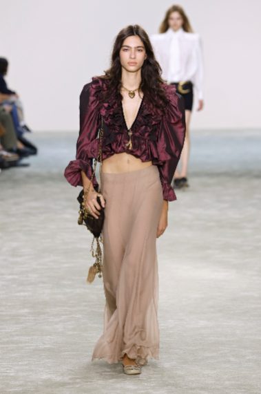 Abiti in seta e modelli in pizzo, dettagli in pelliccia, ruche e volant sfilano alla Paris Fashion Week sulla passerella Autunno/Inverno 2025-2026 di Chloé