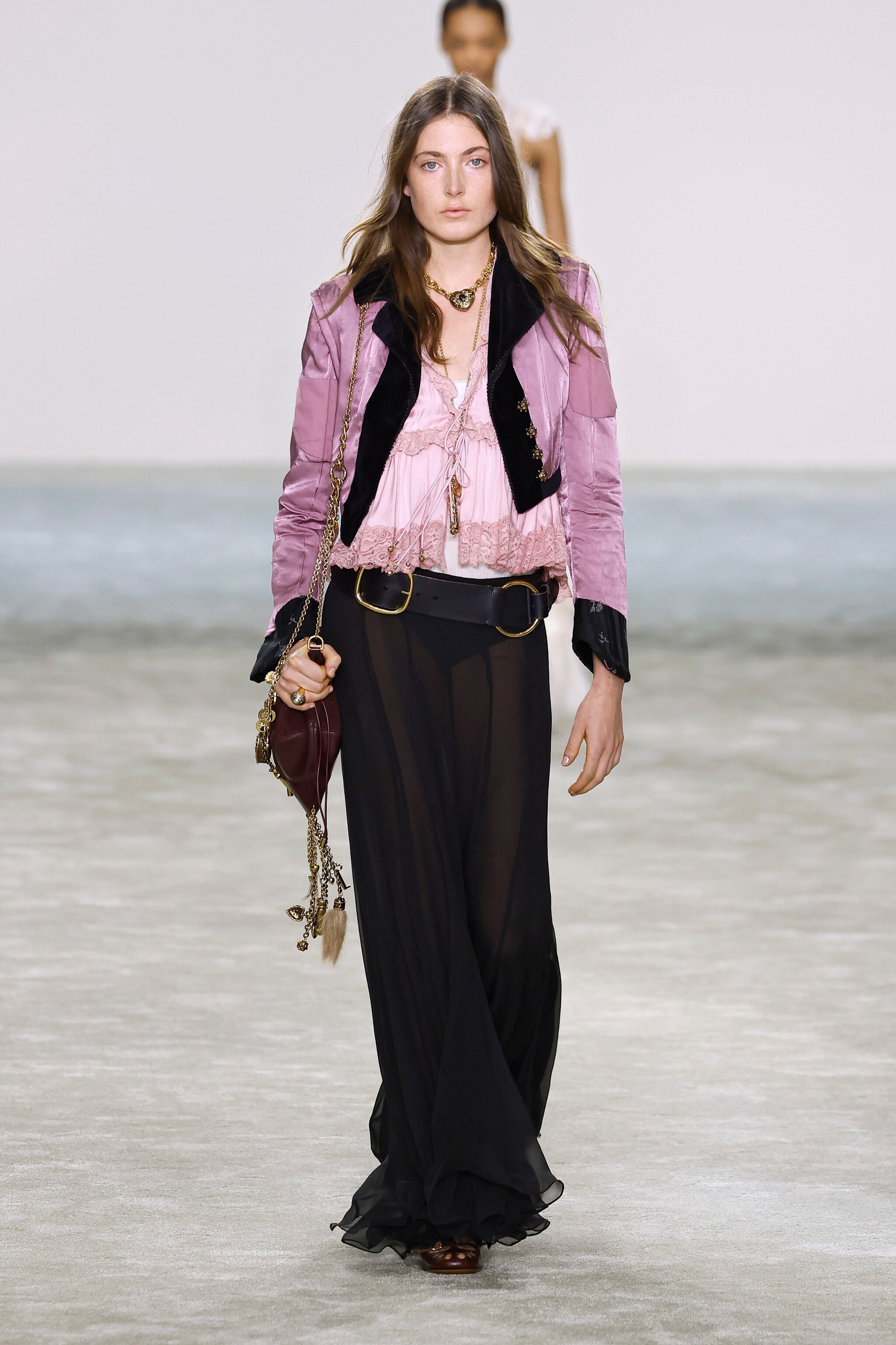 Abiti in seta e modelli in pizzo, dettagli in pelliccia, ruche e volant sfilano alla Paris Fashion Week sulla passerella Autunno/Inverno 2025-2026 di Chloé