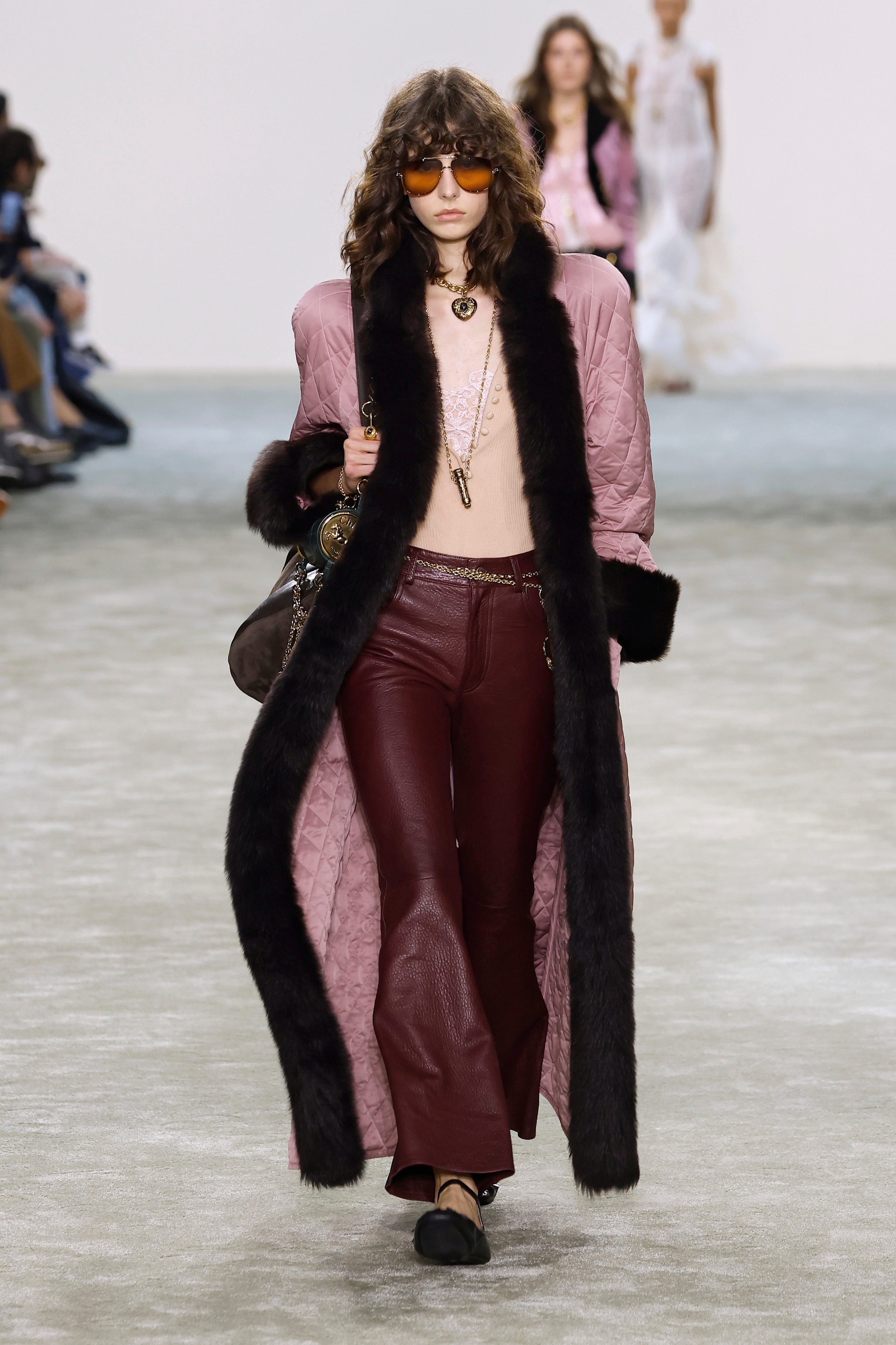 Abiti in seta e modelli in pizzo, dettagli in pelliccia, ruche e volant sfilano alla Paris Fashion Week sulla passerella Autunno/Inverno 2025-2026 di Chloé