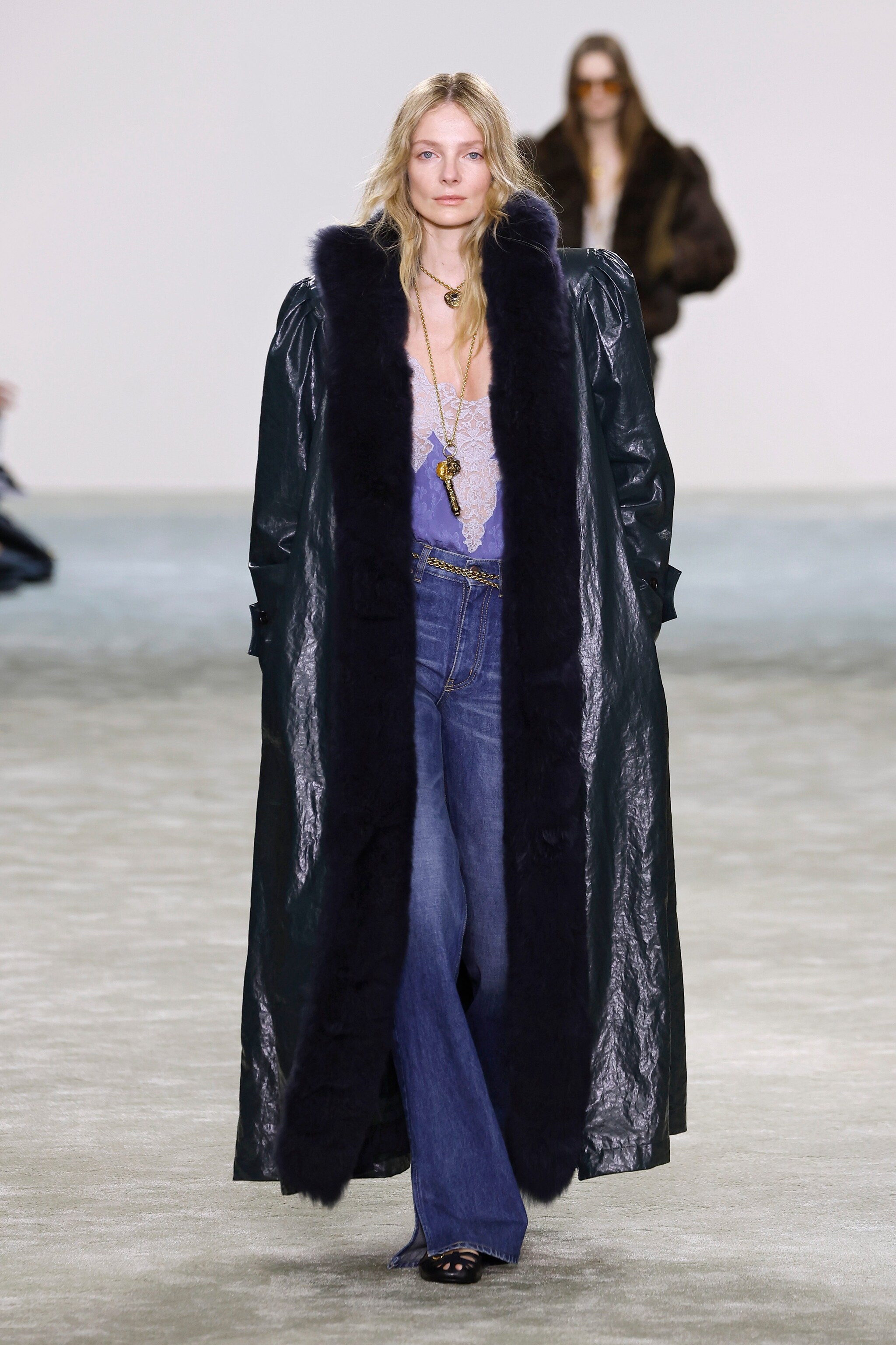 Abiti in seta e modelli in pizzo, dettagli in pelliccia, ruche e volant sfilano alla Paris Fashion Week sulla passerella Autunno/Inverno 2025-2026 di Chloé
