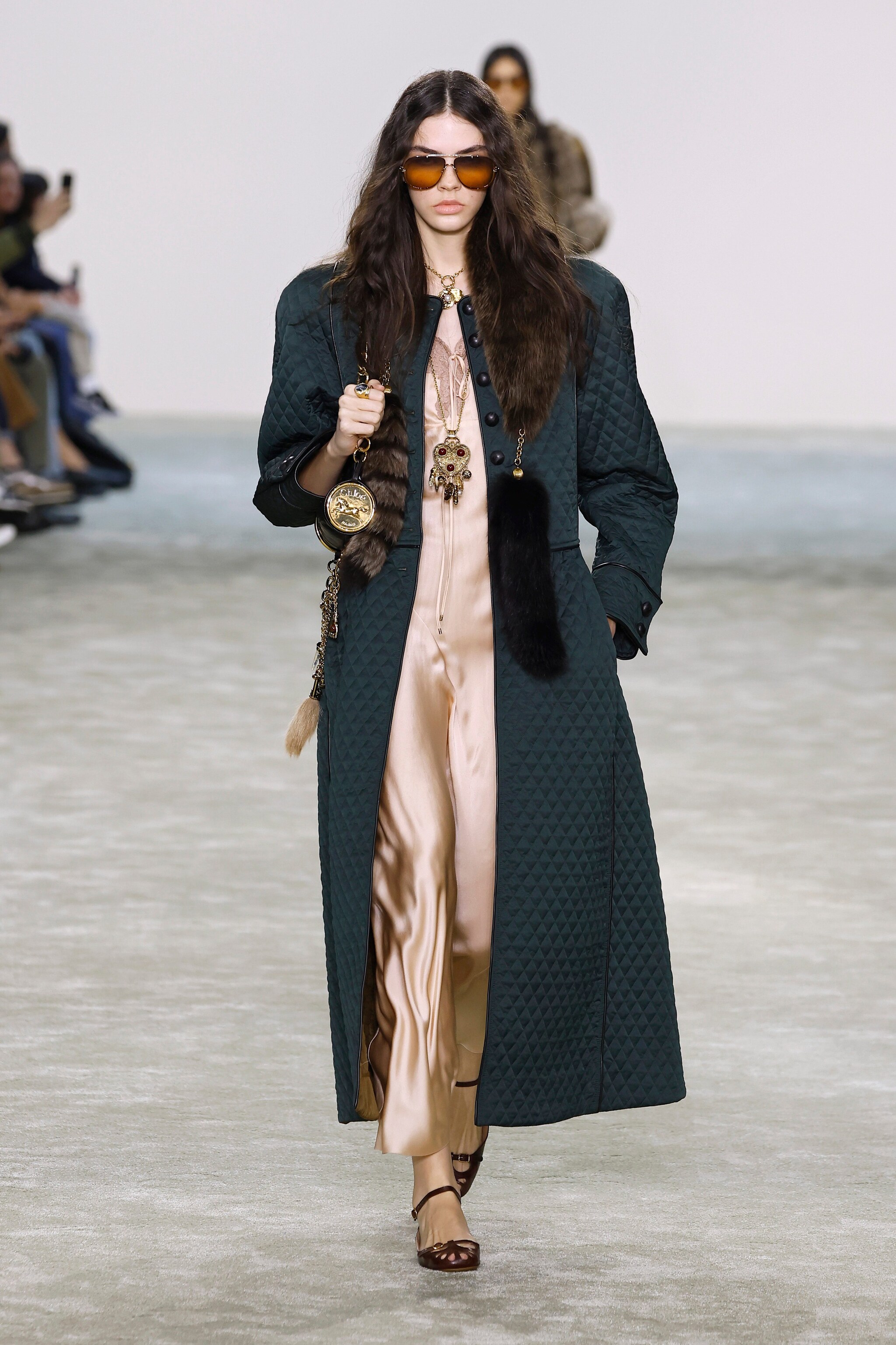 Abiti in seta e modelli in pizzo, dettagli in pelliccia, ruche e volant sfilano alla Paris Fashion Week sulla passerella Autunno/Inverno 2025-2026 di Chloé