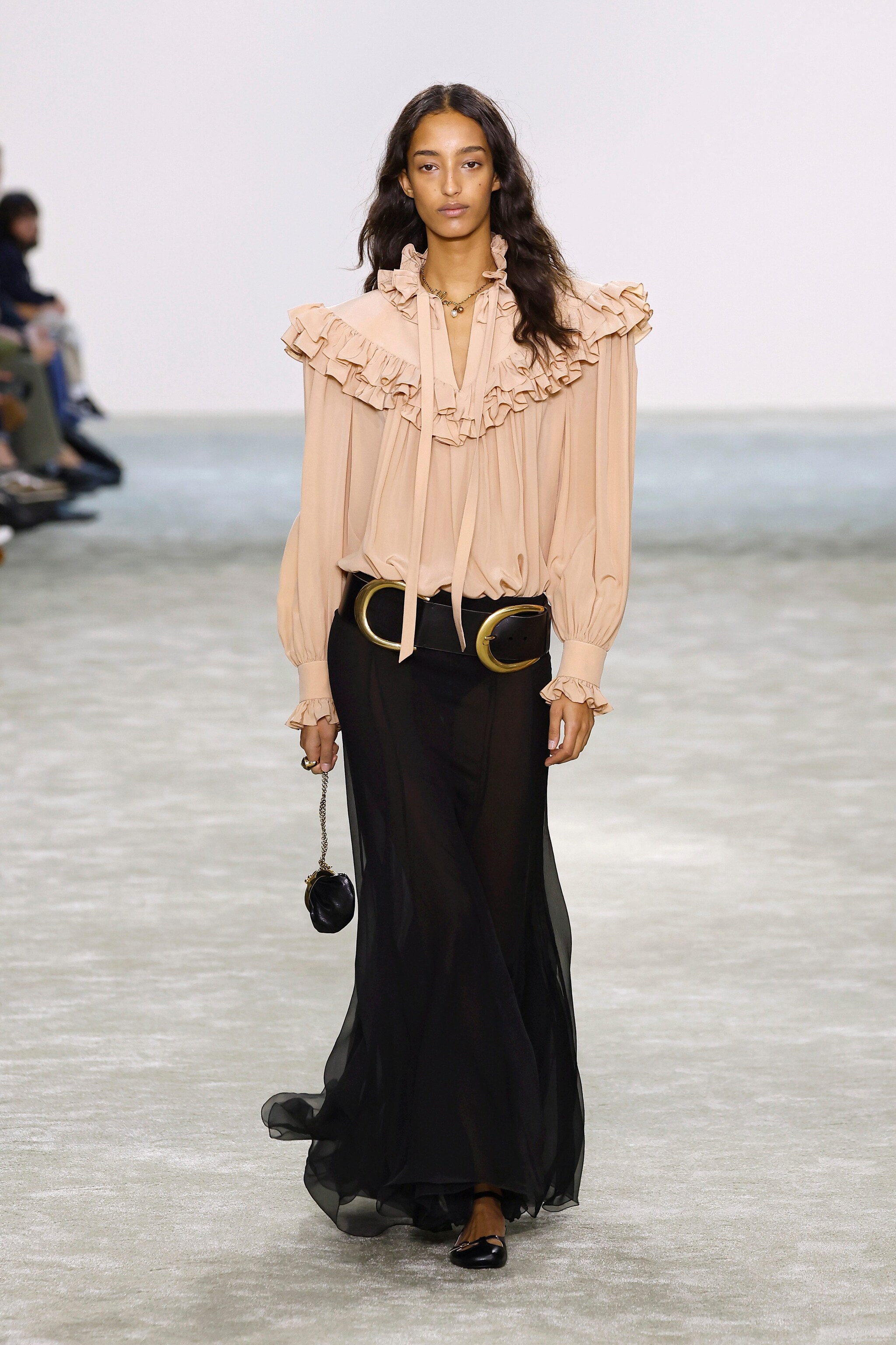 Abiti in seta e modelli in pizzo, dettagli in pelliccia, ruche e volant sfilano alla Paris Fashion Week sulla passerella Autunno/Inverno 2025-2026 di Chloé