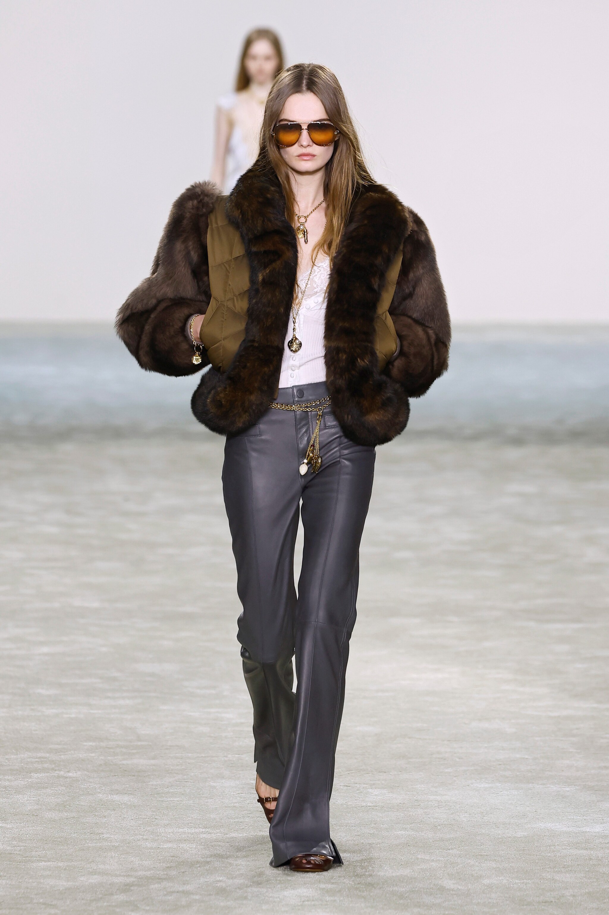 Abiti in seta e modelli in pizzo, dettagli in pelliccia, ruche e volant sfilano alla Paris Fashion Week sulla passerella Autunno/Inverno 2025-2026 di Chloé