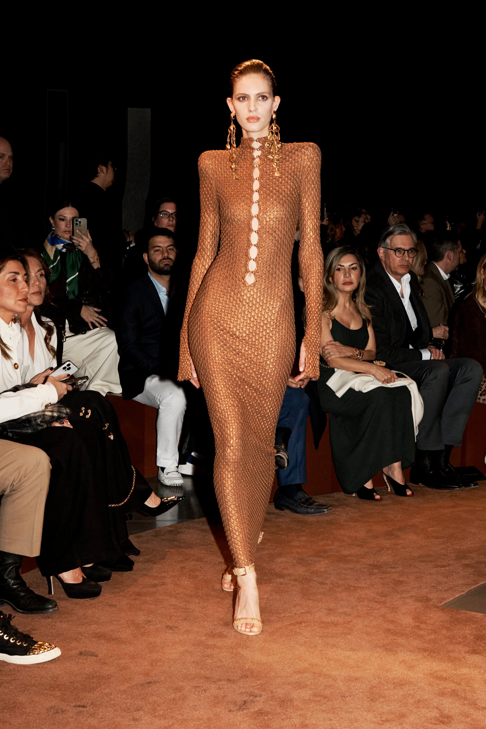 Look total black si alternano a lucenti completi in satin e paillettes marroni, a suit con fantasia a quadretti e ad outfit decorati da cinture in layering nella collezione Autunno/Inverno 2025-2026 di Schiaparelli che ha sfilato alla Paris Fashion Week.