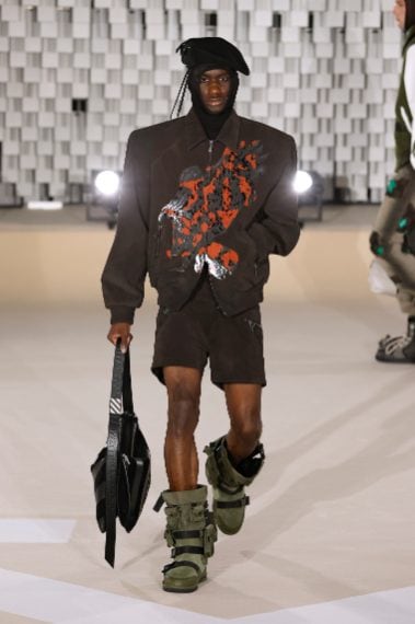 Lo stile militare si mescola con quello college alla Paris Fashion Week sulla passerella Autunno/Inverno 2025-2026 di Off-White, dove sfila una collezione fatta di contrasti di forme, colori e silhouette opposte