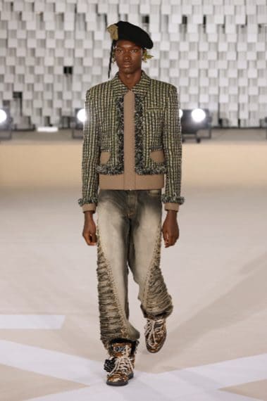 Lo stile militare si mescola con quello college alla Paris Fashion Week sulla passerella Autunno/Inverno 2025-2026 di Off-White, dove sfila una collezione fatta di contrasti di forme, colori e silhouette opposte