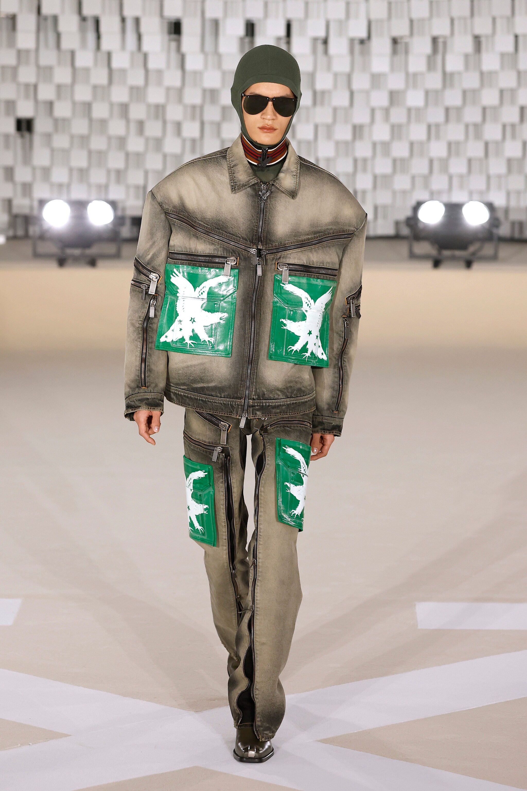 Lo stile militare si mescola con quello college alla Paris Fashion Week sulla passerella Autunno/Inverno 2025-2026 di Off-White, dove sfila una collezione fatta di contrasti di forme, colori e silhouette opposte