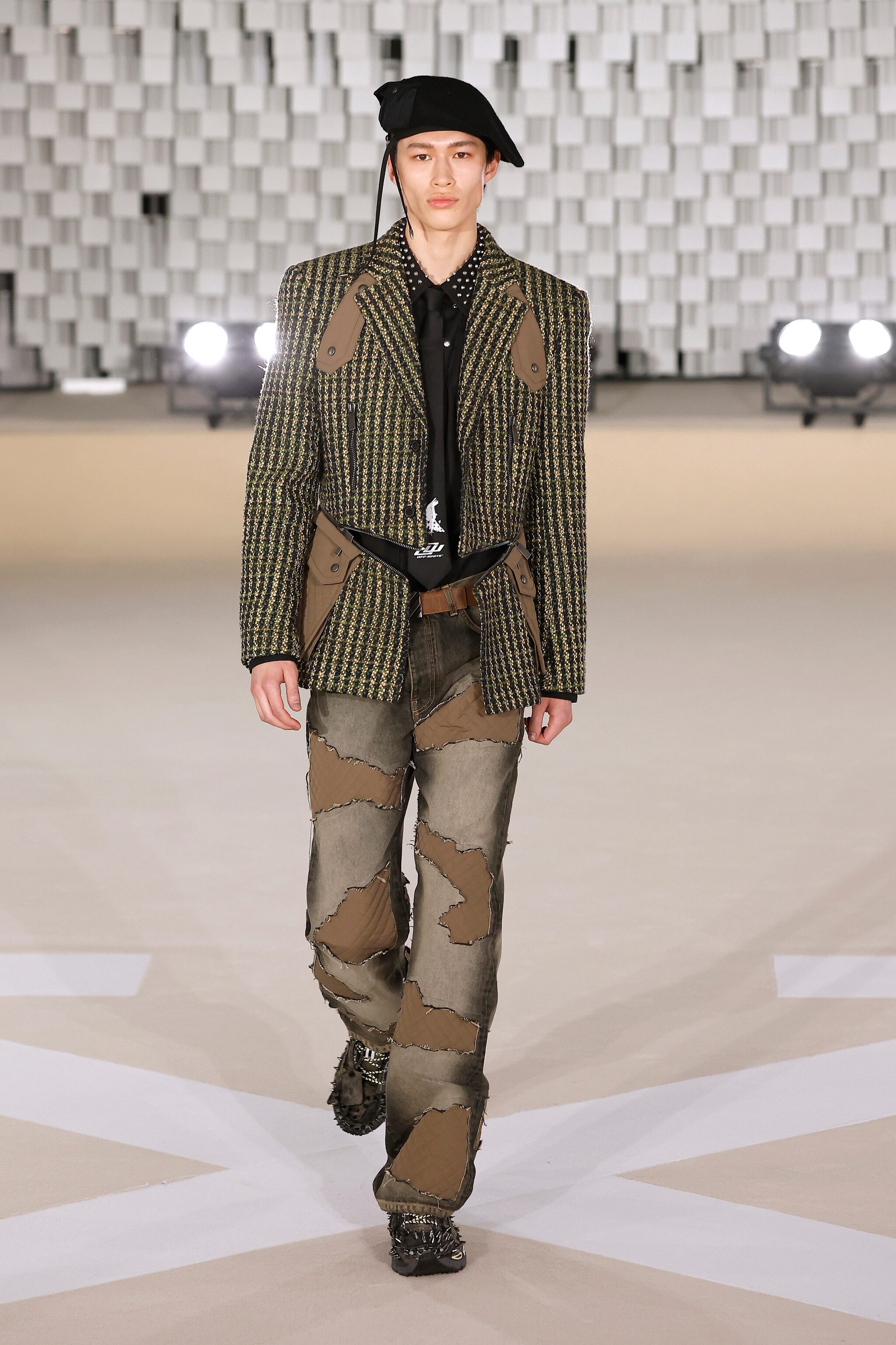 Lo stile militare si mescola con quello college alla Paris Fashion Week sulla passerella Autunno/Inverno 2025-2026 di Off-White, dove sfila una collezione fatta di contrasti di forme, colori e silhouette opposte