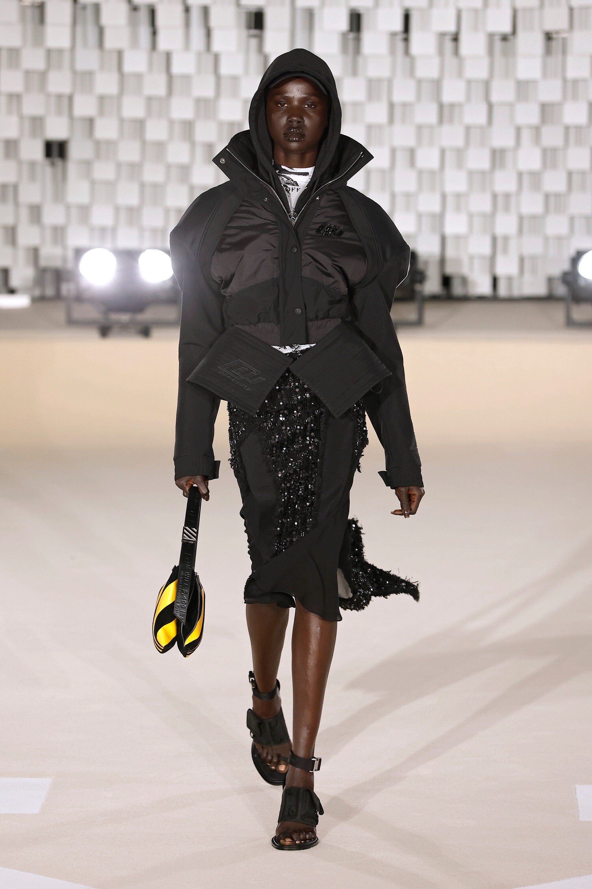 Lo stile militare si mescola con quello college alla Paris Fashion Week sulla passerella Autunno/Inverno 2025-2026 di Off-White, dove sfila una collezione fatta di contrasti di forme, colori e silhouette opposte