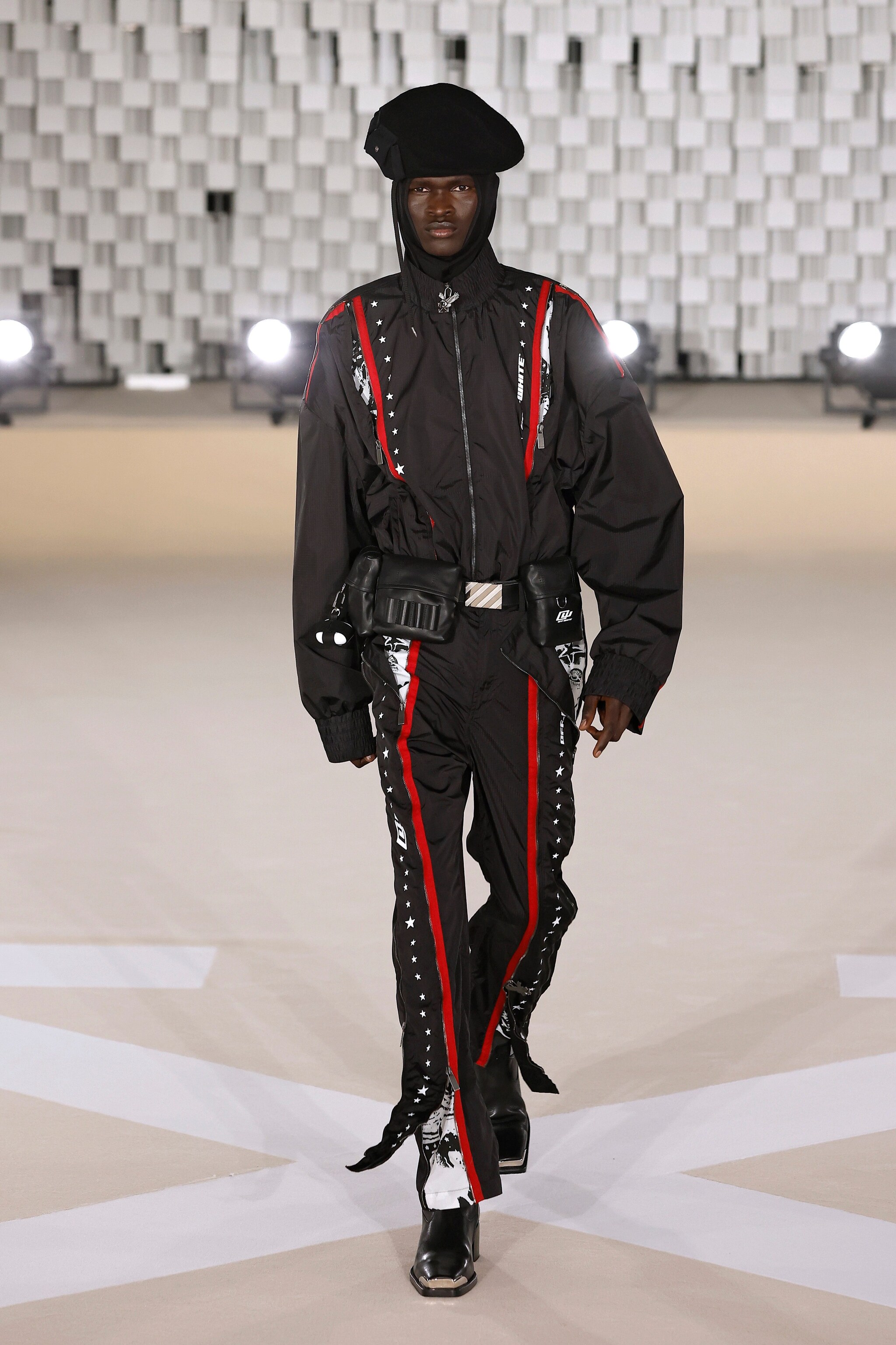 Lo stile militare si mescola con quello college alla Paris Fashion Week sulla passerella Autunno/Inverno 2025-2026 di Off-White, dove sfila una collezione fatta di contrasti di forme, colori e silhouette opposte