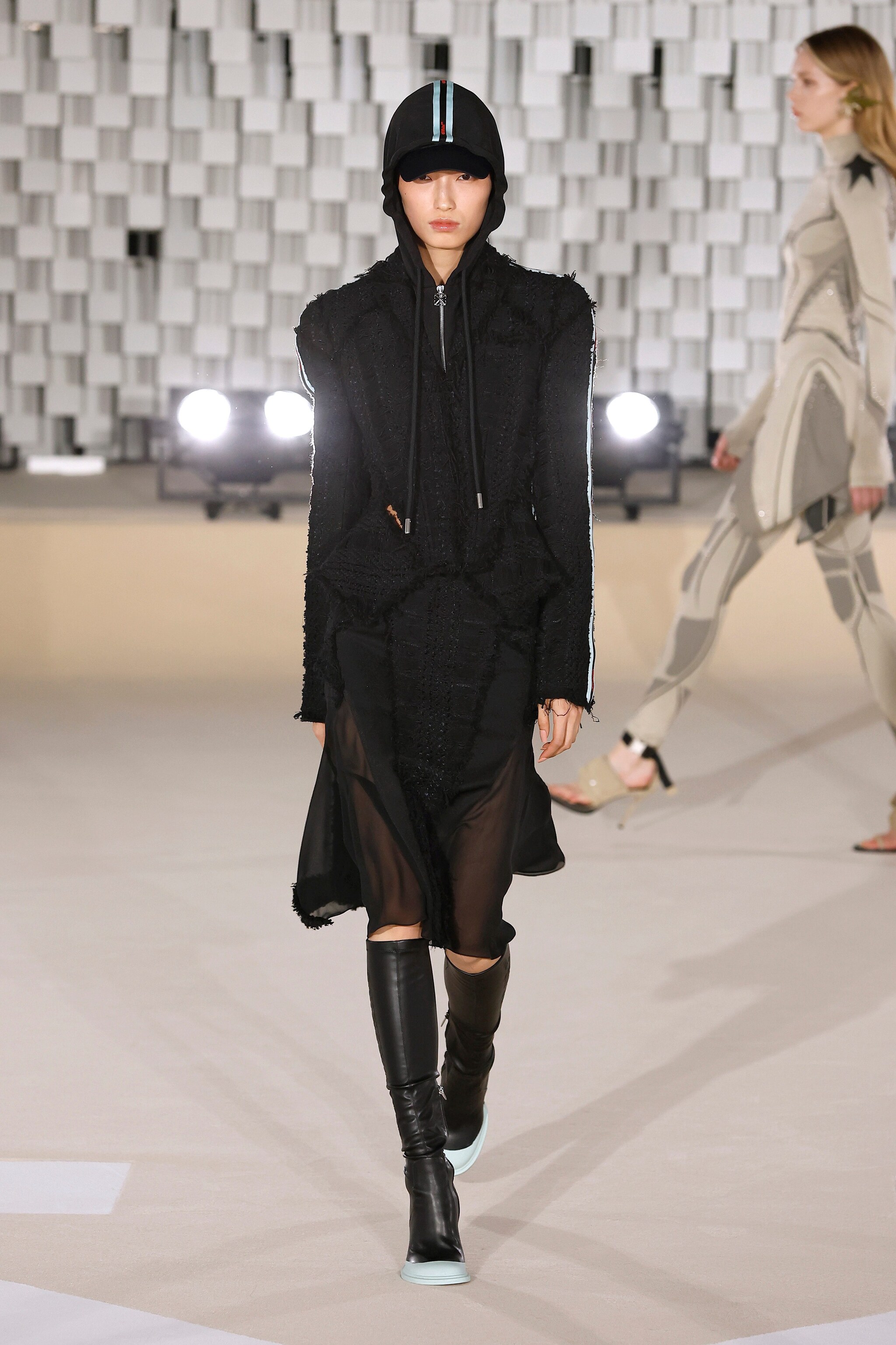 Lo stile militare si mescola con quello college alla Paris Fashion Week sulla passerella Autunno/Inverno 2025-2026 di Off-White, dove sfila una collezione fatta di contrasti di forme, colori e silhouette opposte