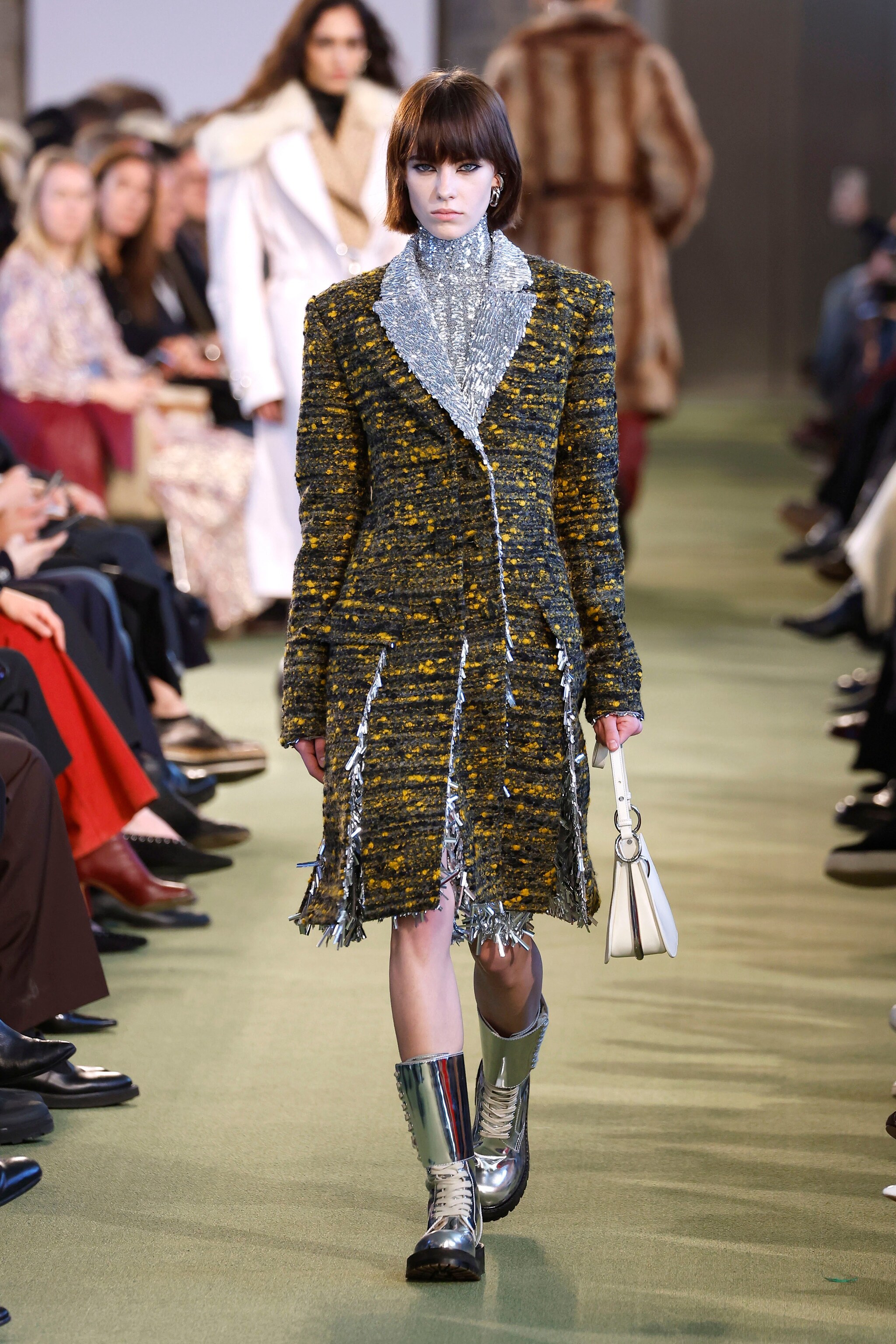 Olri in pelliccia, tagliati o frange e ancora abiti metallici con paillettes in oro e argento sfilano alla Paris Fashion Week sulla passerella Autunno/Inverno 2025-2026 di Rabanne