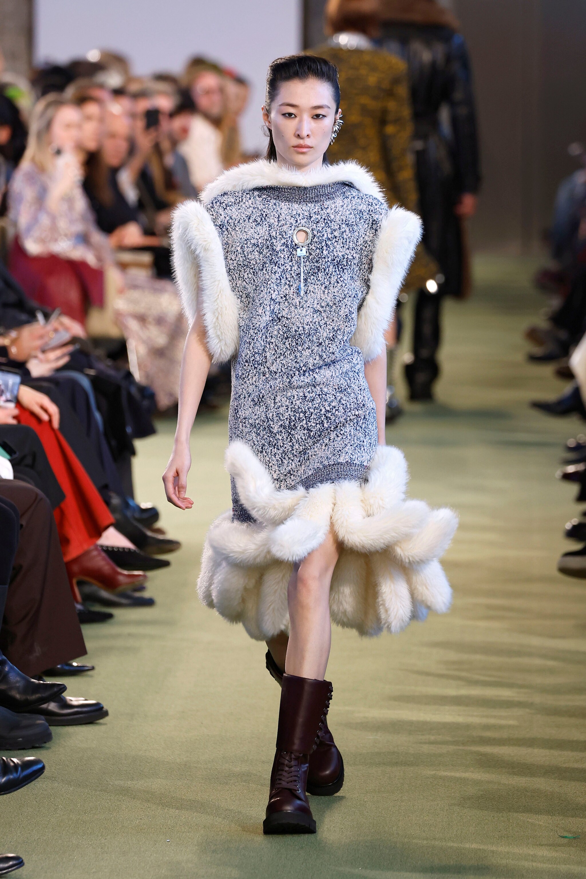 Olri in pelliccia, tagliati o frange e ancora abiti metallici con paillettes in oro e argento sfilano alla Paris Fashion Week sulla passerella Autunno/Inverno 2025-2026 di Rabanne