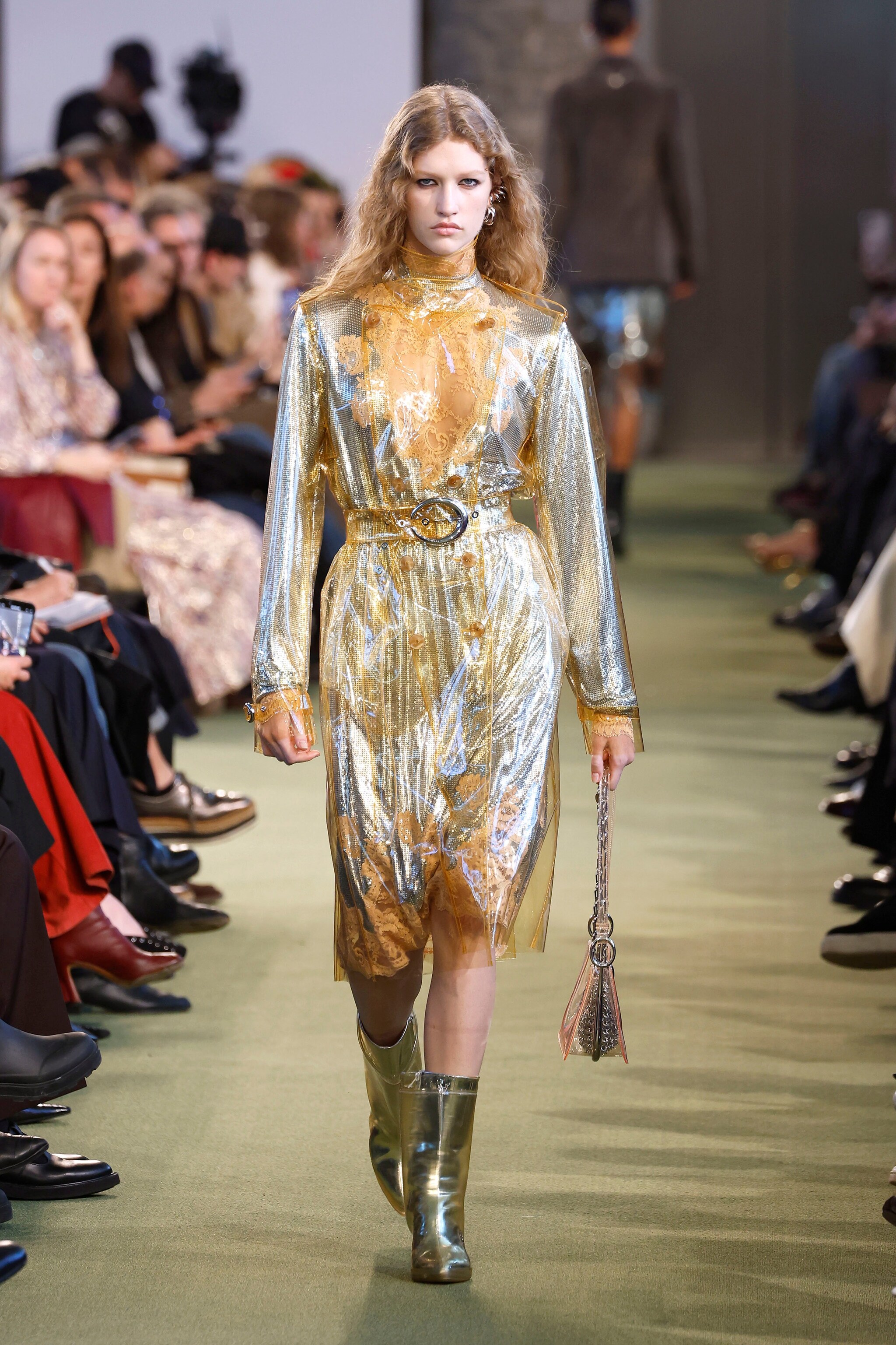 Olri in pelliccia, tagliati o frange e ancora abiti metallici con paillettes in oro e argento sfilano alla Paris Fashion Week sulla passerella Autunno/Inverno 2025-2026 di Rabanne