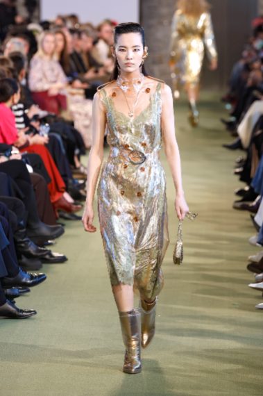 Olri in pelliccia, tagliati o frange e ancora abiti metallici con paillettes in oro e argento sfilano alla Paris Fashion Week sulla passerella Autunno/Inverno 2025-2026 di Rabanne