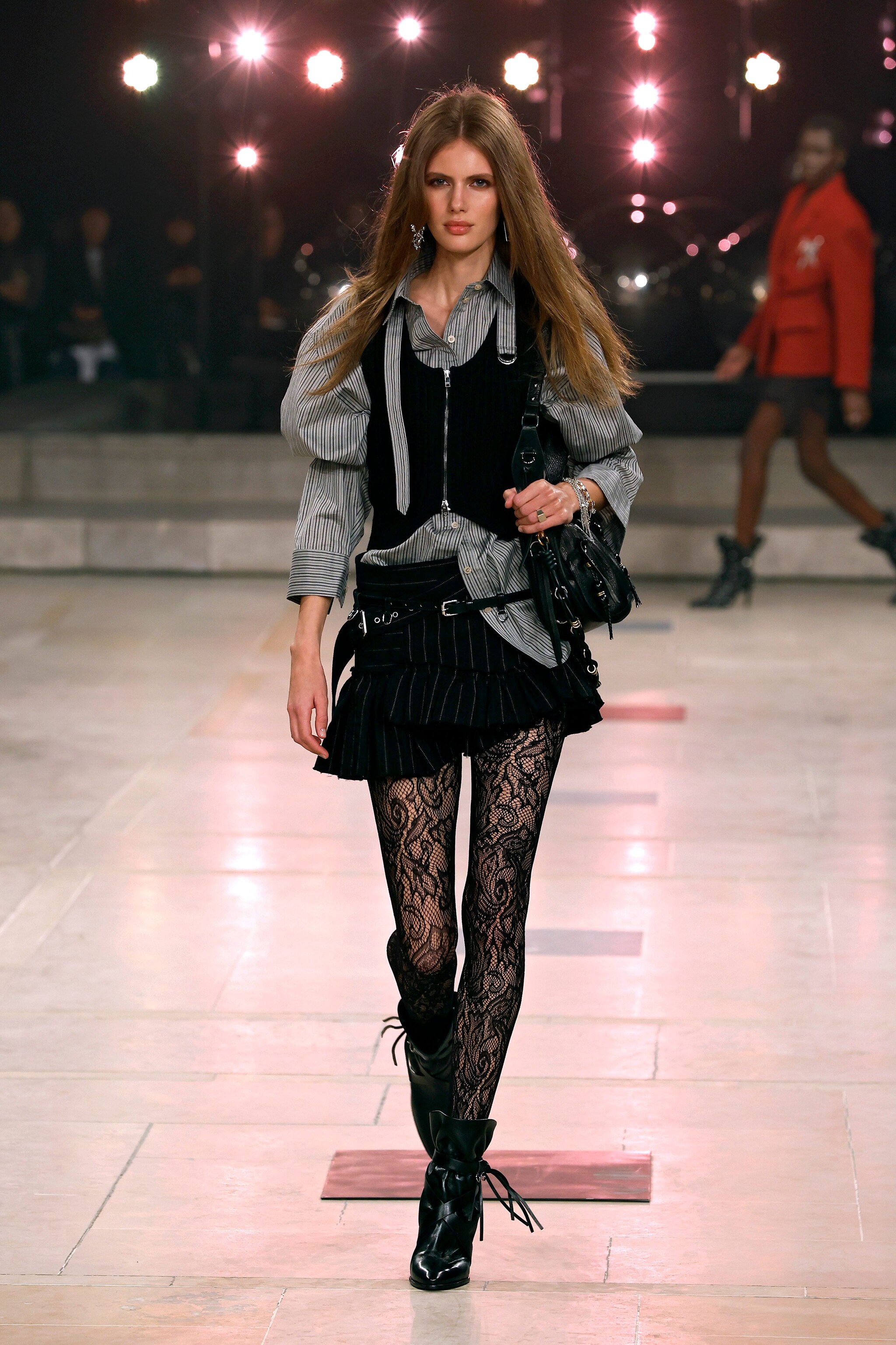 Fantasie gessate, look in pelle, pantaloni skinny e blazer dalle spalle oversize sfilano alla Paris Fashion Week sulla passerella Autunno/Inverno 2025-2026 di Isabel Marant