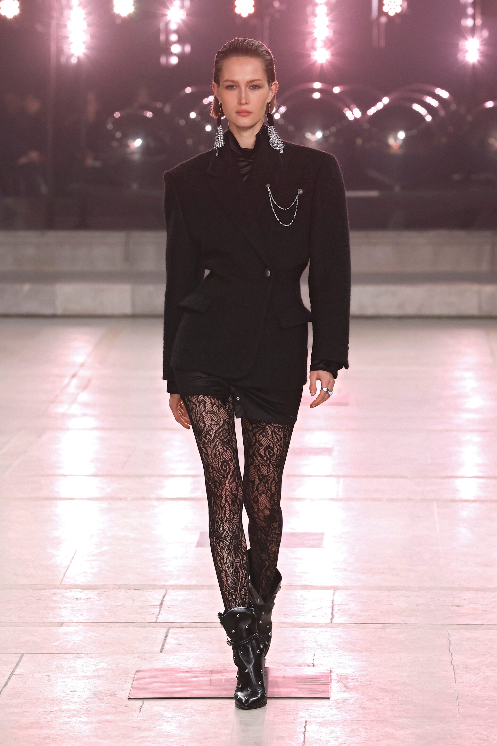 Fantasie gessate, look in pelle, pantaloni skinny e blazer dalle spalle oversize sfilano alla Paris Fashion Week sulla passerella Autunno/Inverno 2025-2026 di Isabel Marant
