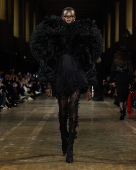 Drammatici abiti con balze e ruche, enormi giacche furry con spalle volumetriche, abiti crochet dalle gonne a ruota e ancora incrostazioni di cristalli, abiti rosso fuoco e look total black sfilano alla Paris Fashion Week sulla passerella Autunno/Inverno 2025-2026 di McQueen