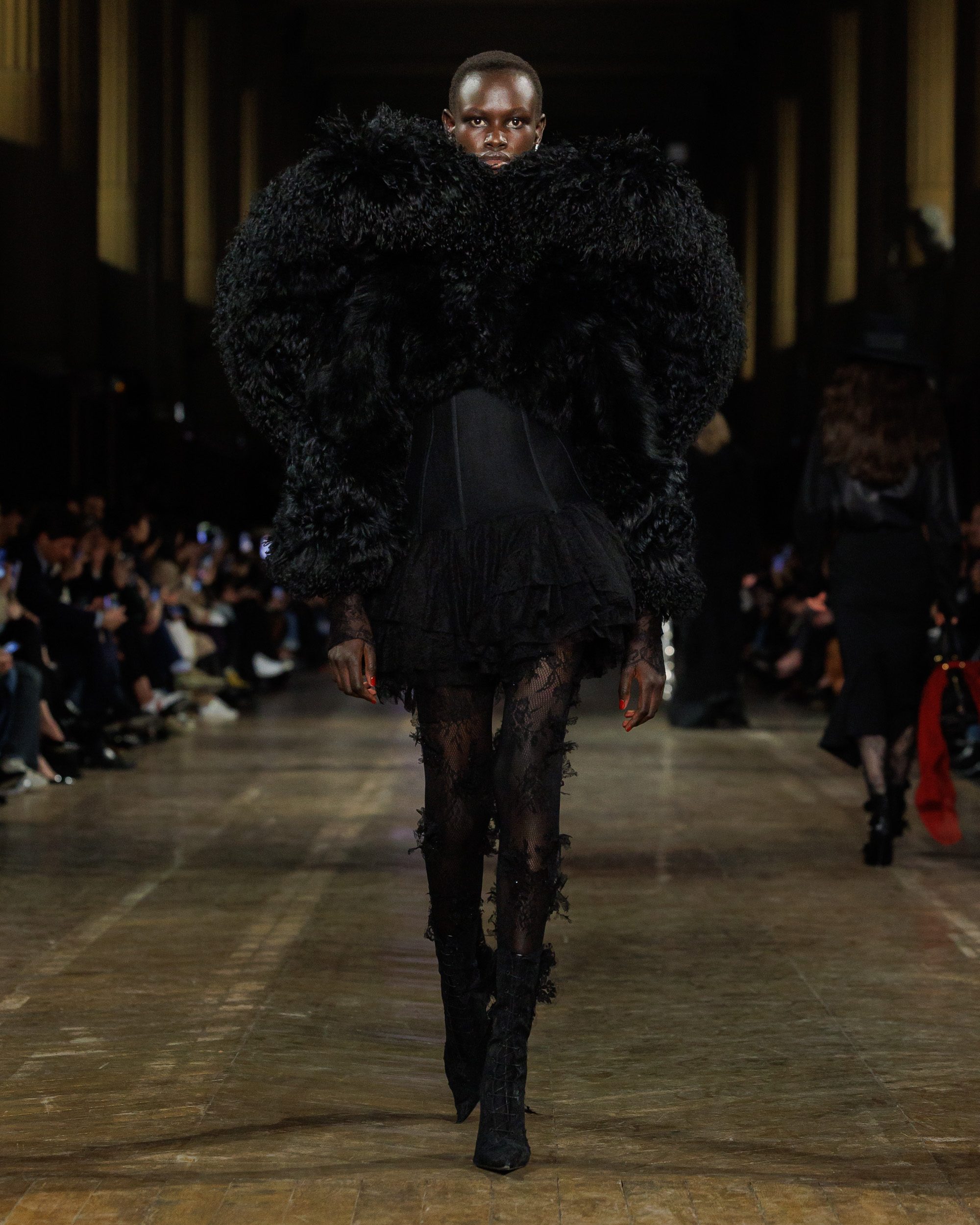Drammatici abiti con balze e ruche, enormi giacche furry con spalle volumetriche, abiti crochet dalle gonne a ruota e ancora incrostazioni di cristalli, abiti rosso fuoco e look total black sfilano alla Paris Fashion Week sulla passerella Autunno/Inverno 2025-2026 di McQueen