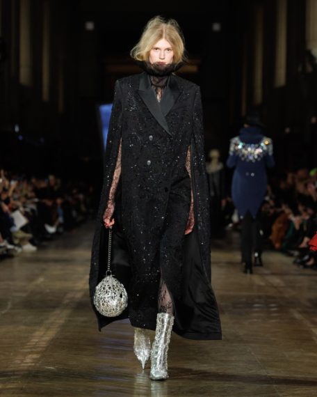 Drammatici abiti con balze e ruche, enormi giacche furry con spalle volumetriche, abiti crochet dalle gonne a ruota e ancora incrostazioni di cristalli, abiti rosso fuoco e look total black sfilano alla Paris Fashion Week sulla passerella Autunno/Inverno 2025-2026 di McQueen