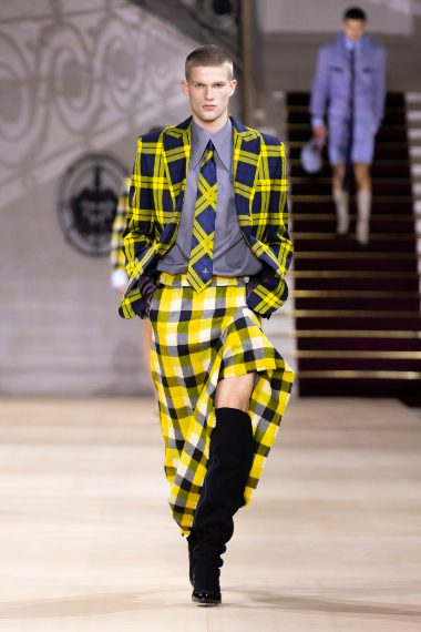 Blazer doppiopetto, completi a quadretti, gonne asimmetriche, maxi trench e abiti con scollature drappeggiate o coperti da macro pois sfilano alla Paris Fashion Week sulla passerella Autunno/Inverno 2025-2026 di Vivienne Westwood