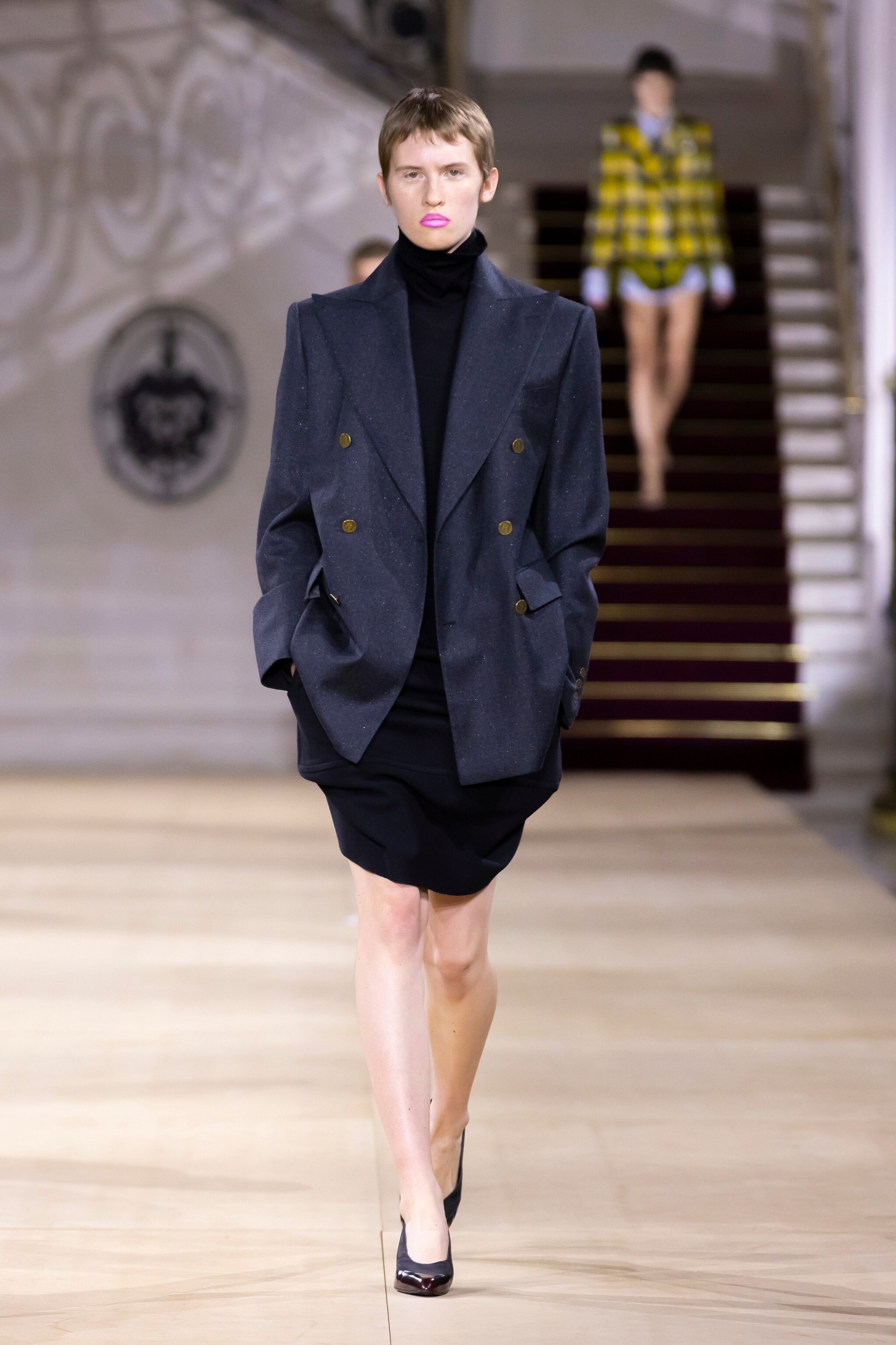 Blazer doppiopetto, completi a quadretti, gonne asimmetriche, maxi trench e abiti con scollature drappeggiate o coperti da macro pois sfilano alla Paris Fashion Week sulla passerella Autunno/Inverno 2025-2026 di Vivienne Westwood
