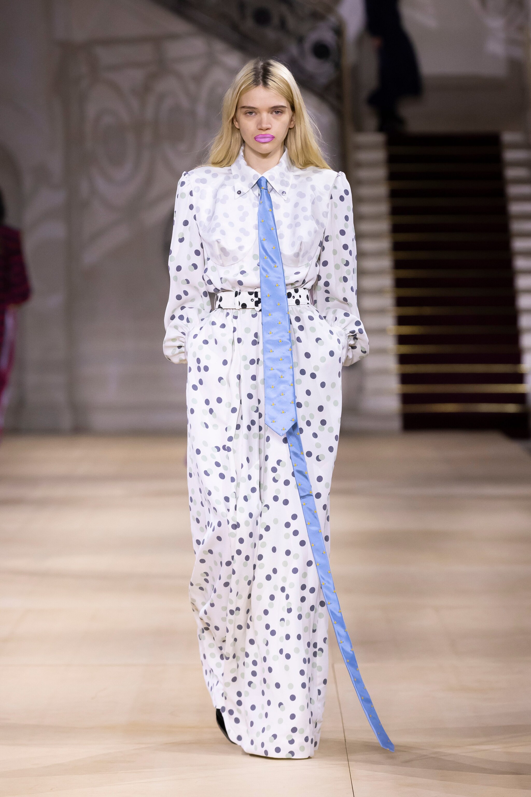 Blazer doppiopetto, completi a quadretti, gonne asimmetriche, maxi trench e abiti con scollature drappeggiate o coperti da macro pois sfilano alla Paris Fashion Week sulla passerella Autunno/Inverno 2025-2026 di Vivienne Westwood