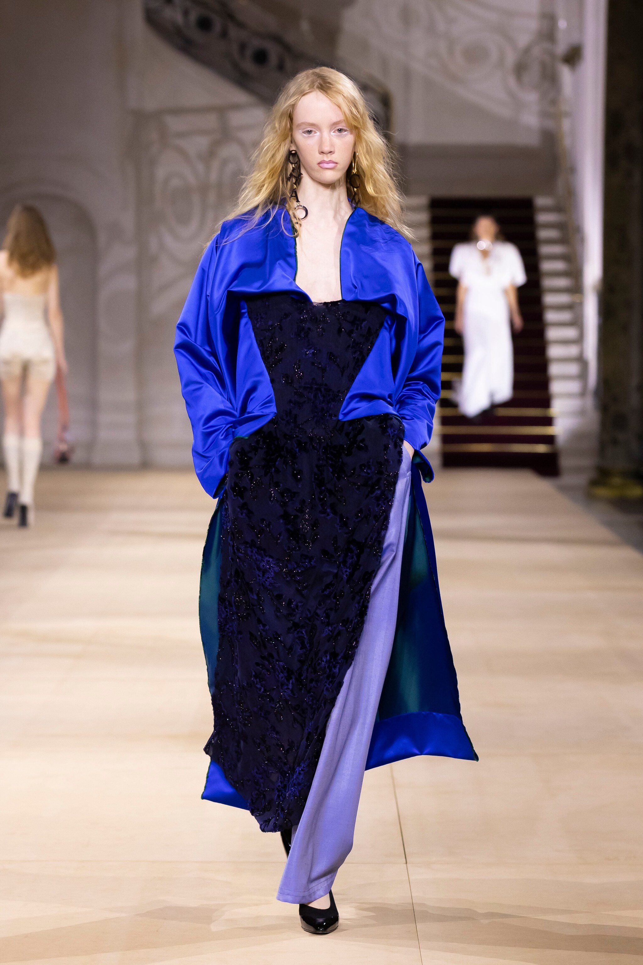 Blazer doppiopetto, completi a quadretti, gonne asimmetriche, maxi trench e abiti con scollature drappeggiate o coperti da macro pois sfilano alla Paris Fashion Week sulla passerella Autunno/Inverno 2025-2026 di Vivienne Westwood