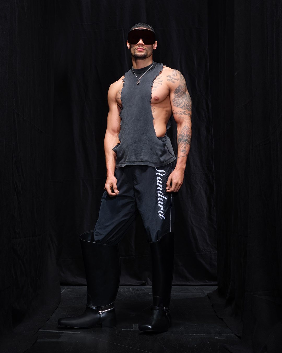 Lo sportswear incontra la couture e l'abbigliamento formale sulla passerella Autunno/Inverno 2025-2026 di Balenciaga, dove sfilano suits e completi "da ufficio" alternati a tute in acetato e lunghi abiti che sembrano un costume olimpionico con maxi strascico.