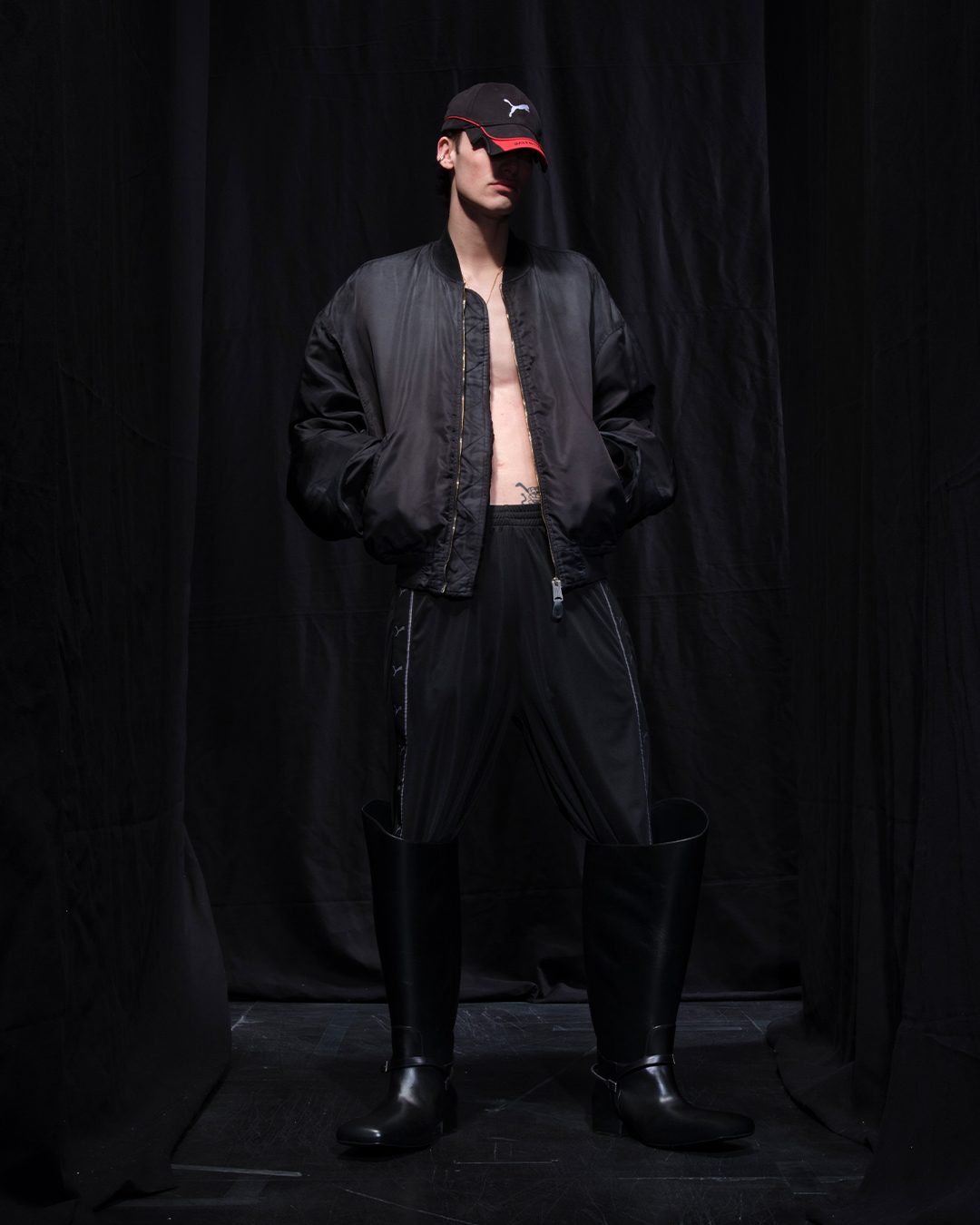 Lo sportswear incontra la couture e l'abbigliamento formale sulla passerella Autunno/Inverno 2025-2026 di Balenciaga, dove sfilano suits e completi "da ufficio" alternati a tute in acetato e lunghi abiti che sembrano un costume olimpionico con maxi strascico.