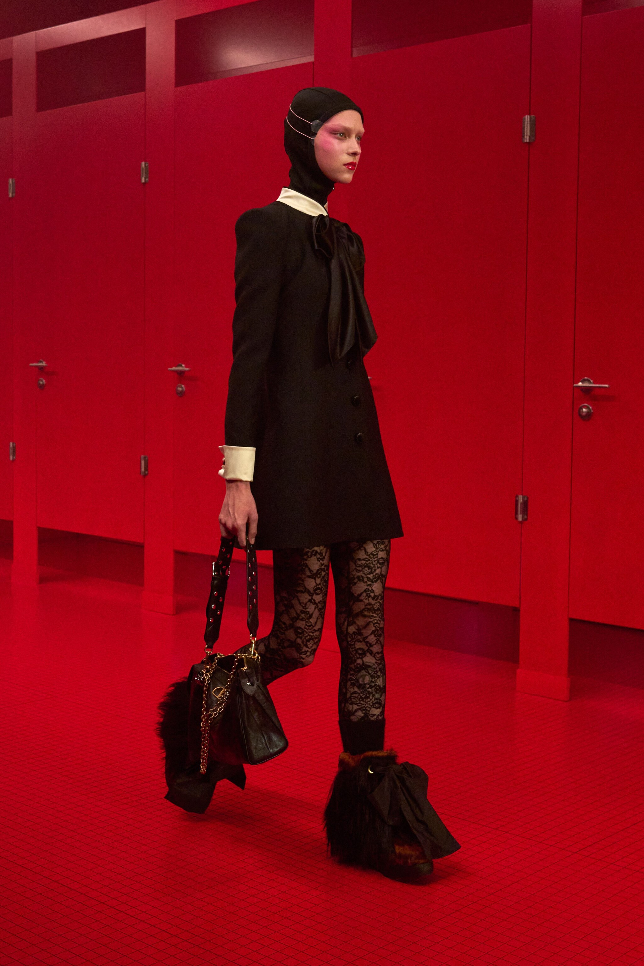 Abiti e cappotti con profili in pelliccia, body in pizzo, gonne con baschine e ancora ruche, modelli dalle spalle appuntite e maxi fiocchi sfilano alla Paris Fashion Week sulla passerella Autunno/Inverno 2025-2026 di Valentino