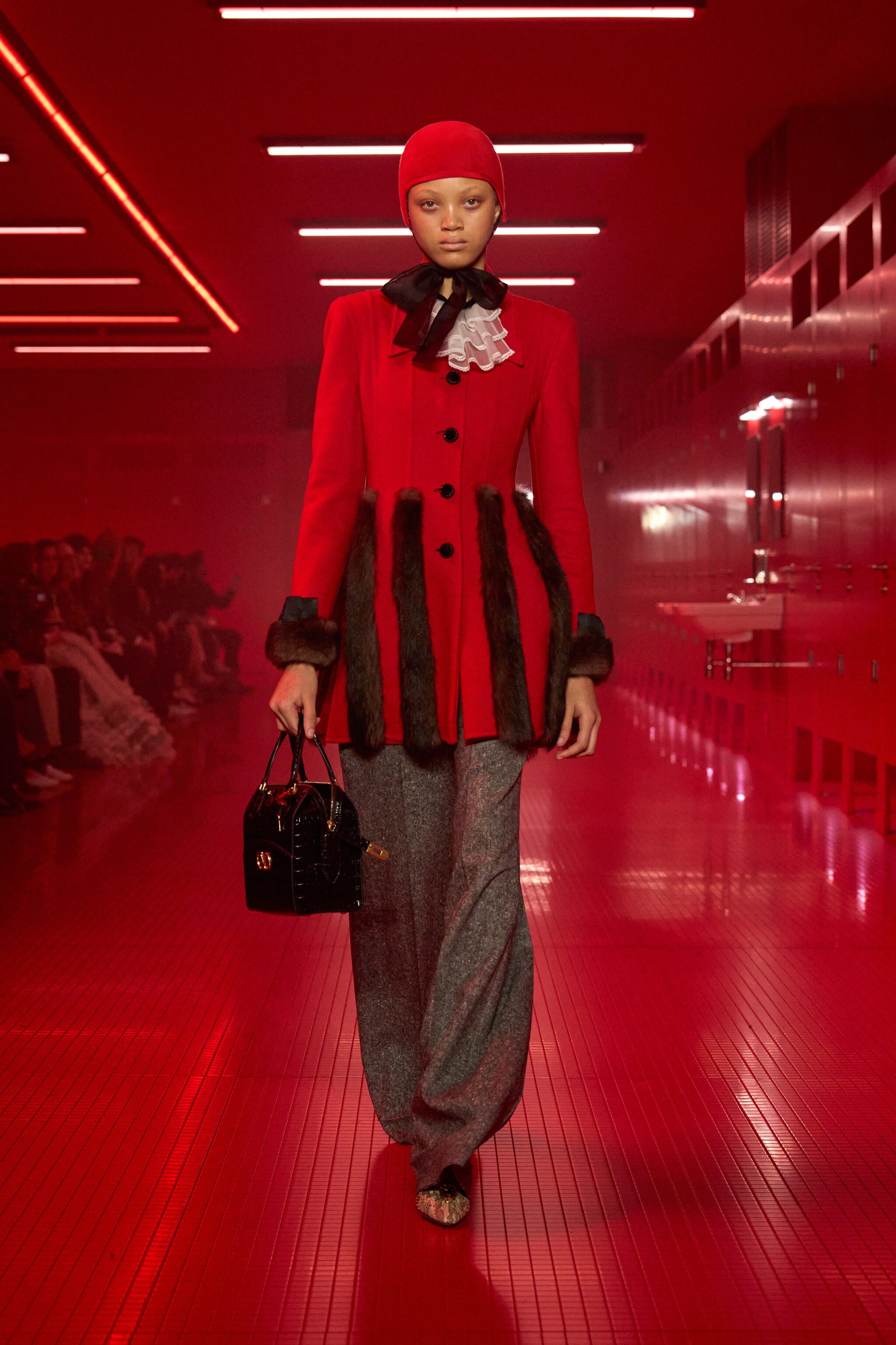 Abiti e cappotti con profili in pelliccia, body in pizzo, gonne con baschine e ancora ruche, modelli dalle spalle appuntite e maxi fiocchi sfilano alla Paris Fashion Week sulla passerella Autunno/Inverno 2025-2026 di Valentino