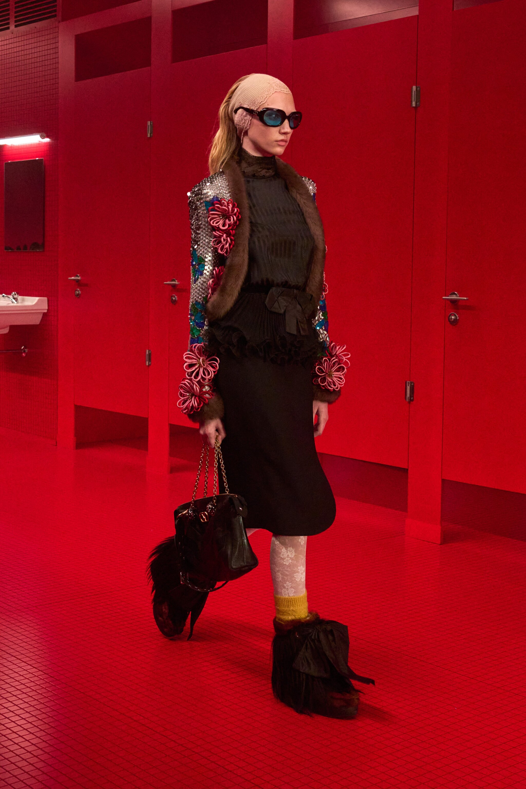 Abiti e cappotti con profili in pelliccia, body in pizzo, gonne con baschine e ancora ruche, modelli dalle spalle appuntite e maxi fiocchi sfilano alla Paris Fashion Week sulla passerella Autunno/Inverno 2025-2026 di Valentino