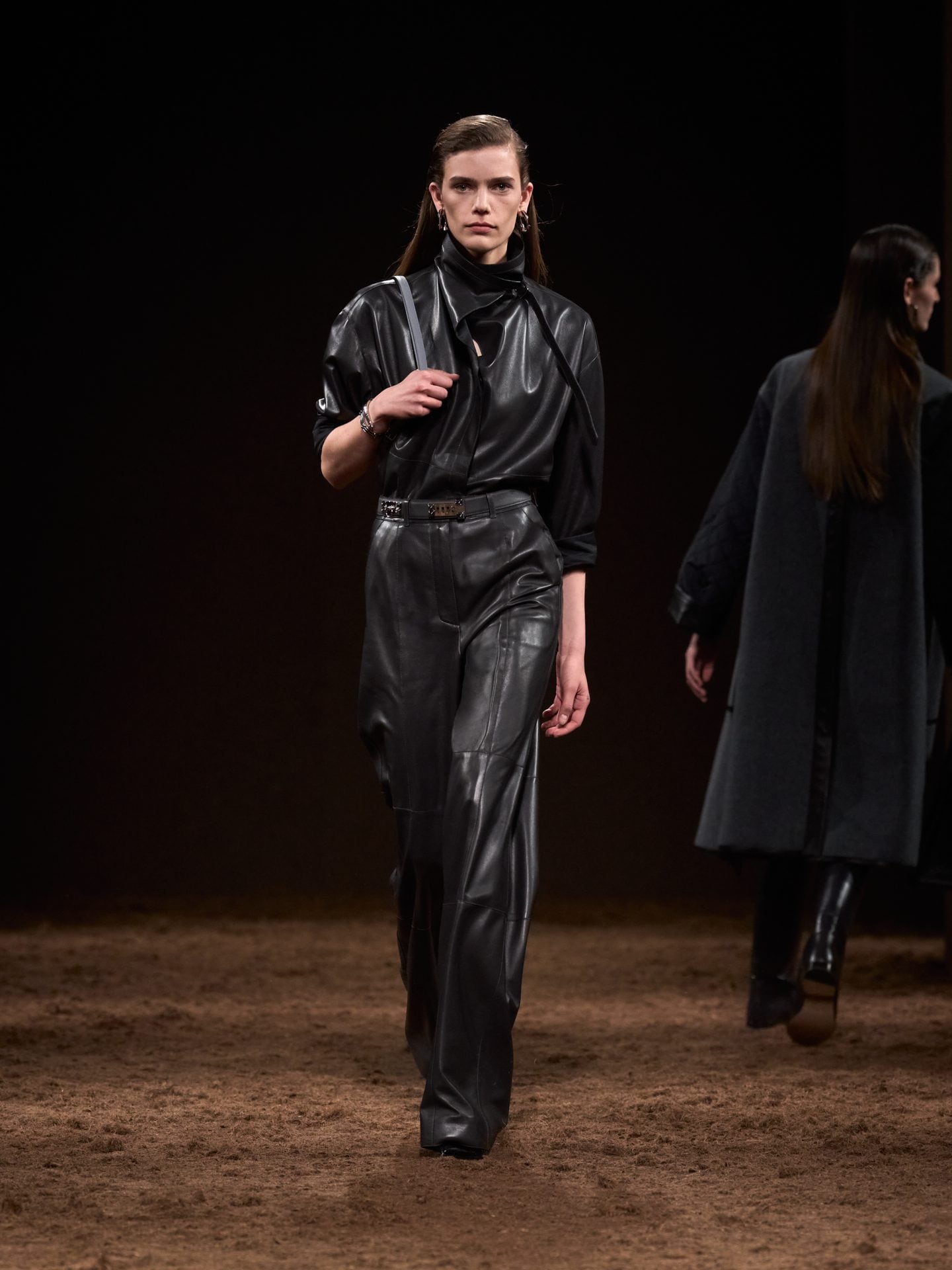 Gilet, giacche matelassè e trench in pelle, tubini in maglia o velluto e look monocolore sfilano alla Paris Fashion Week sulla passerella Autunno/Inverno 2025-2026 di Hermes