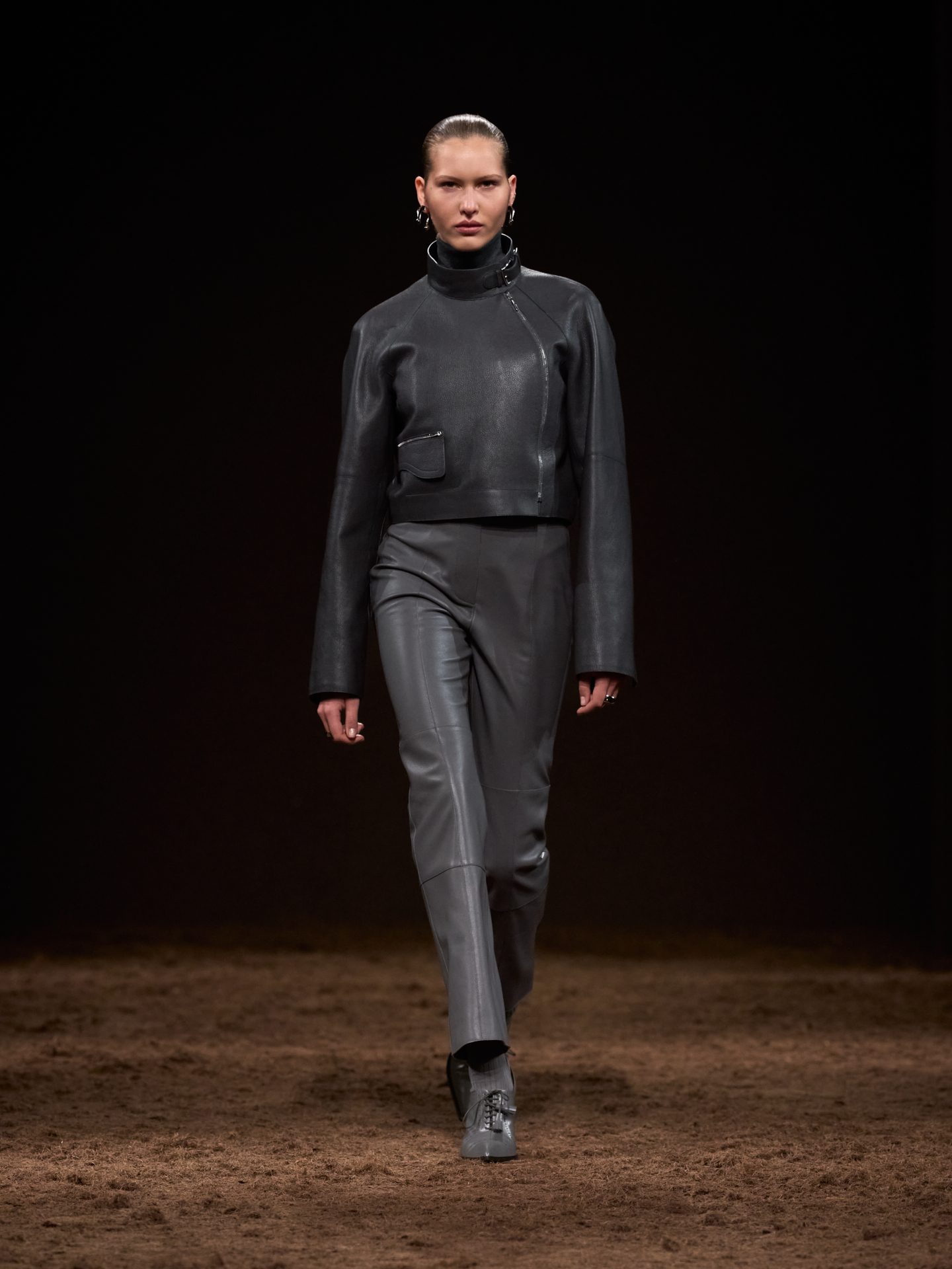 Gilet, giacche matelassè e trench in pelle, tubini in maglia o velluto e look monocolore sfilano alla Paris Fashion Week sulla passerella Autunno/Inverno 2025-2026 di Hermes
