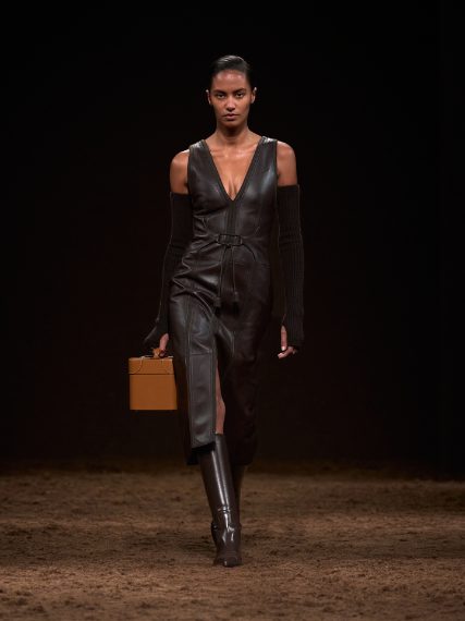 Gilet, giacche matelassè e trench in pelle, tubini in maglia o velluto e look monocolore sfilano alla Paris Fashion Week sulla passerella Autunno/Inverno 2025-2026 di Hermes