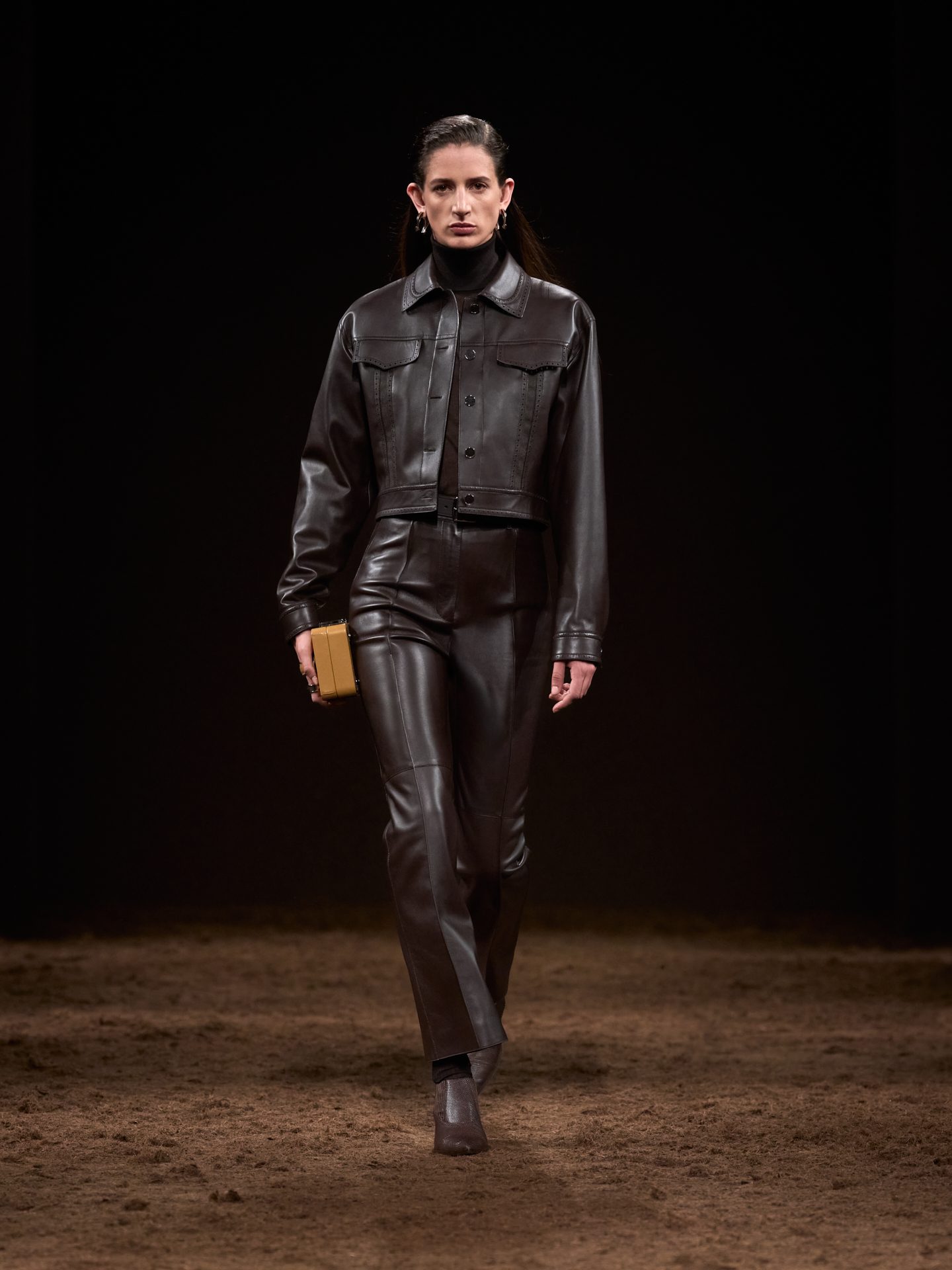 Gilet, giacche matelassè e trench in pelle, tubini in maglia o velluto e look monocolore sfilano alla Paris Fashion Week sulla passerella Autunno/Inverno 2025-2026 di Hermes