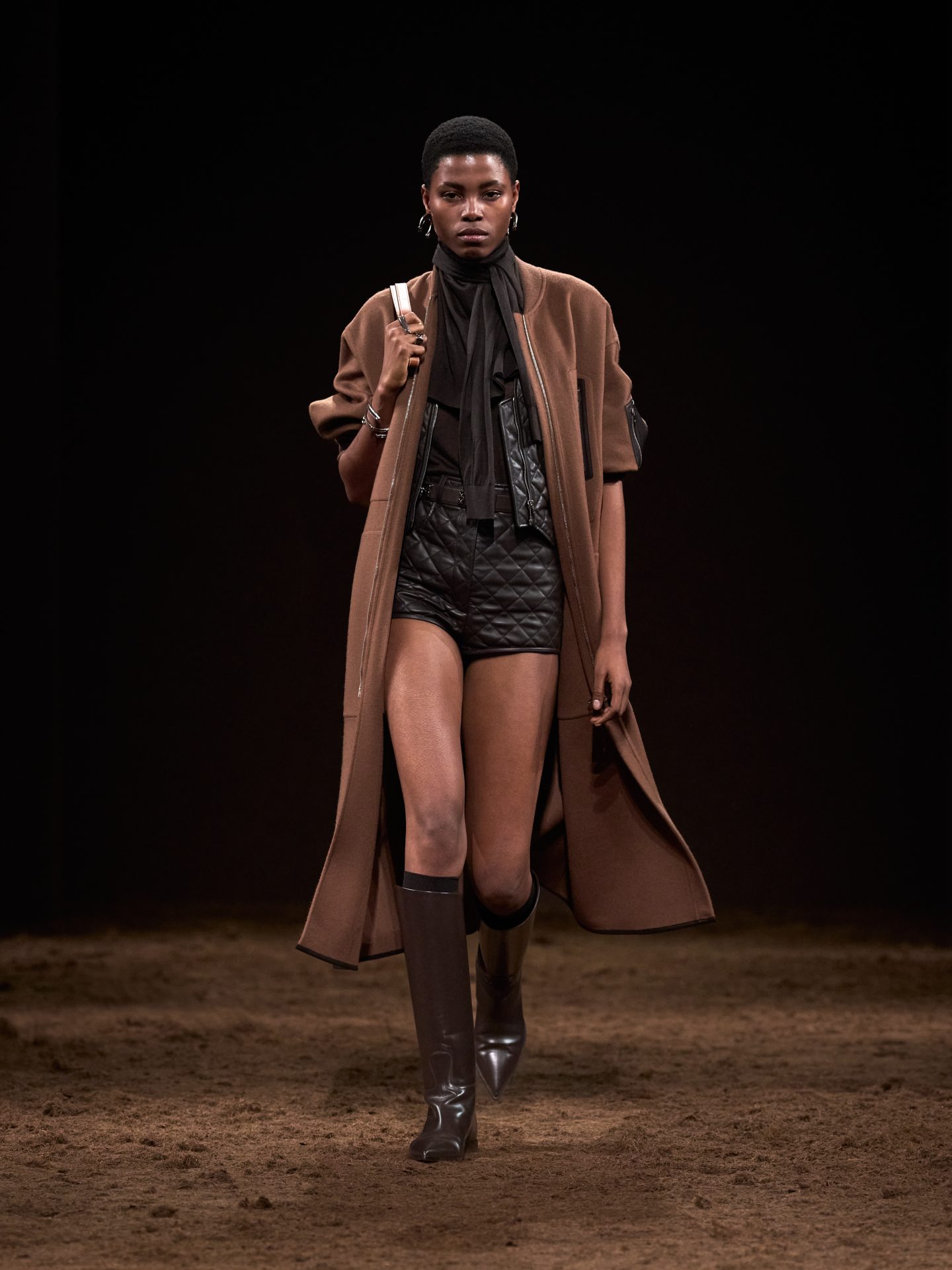 Gilet, giacche matelassè e trench in pelle, tubini in maglia o velluto e look monocolore sfilano alla Paris Fashion Week sulla passerella Autunno/Inverno 2025-2026 di Hermes