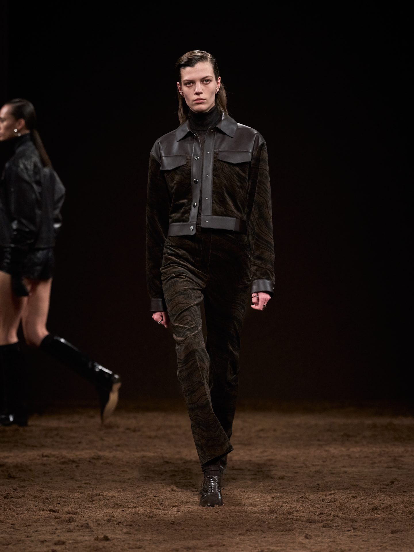 Gilet, giacche matelassè e trench in pelle, tubini in maglia o velluto e look monocolore sfilano alla Paris Fashion Week sulla passerella Autunno/Inverno 2025-2026 di Hermes