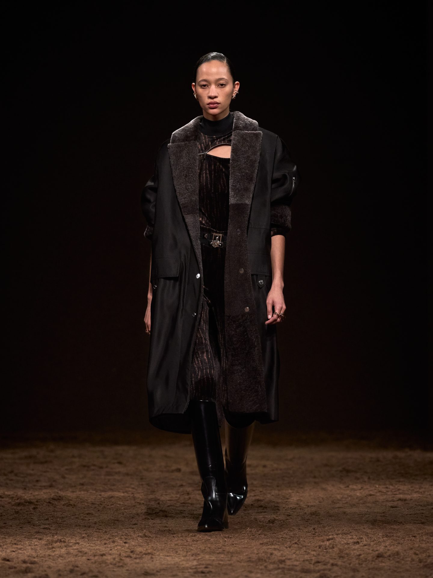 Gilet, giacche matelassè e trench in pelle, tubini in maglia o velluto e look monocolore sfilano alla Paris Fashion Week sulla passerella Autunno/Inverno 2025-2026 di Hermes
