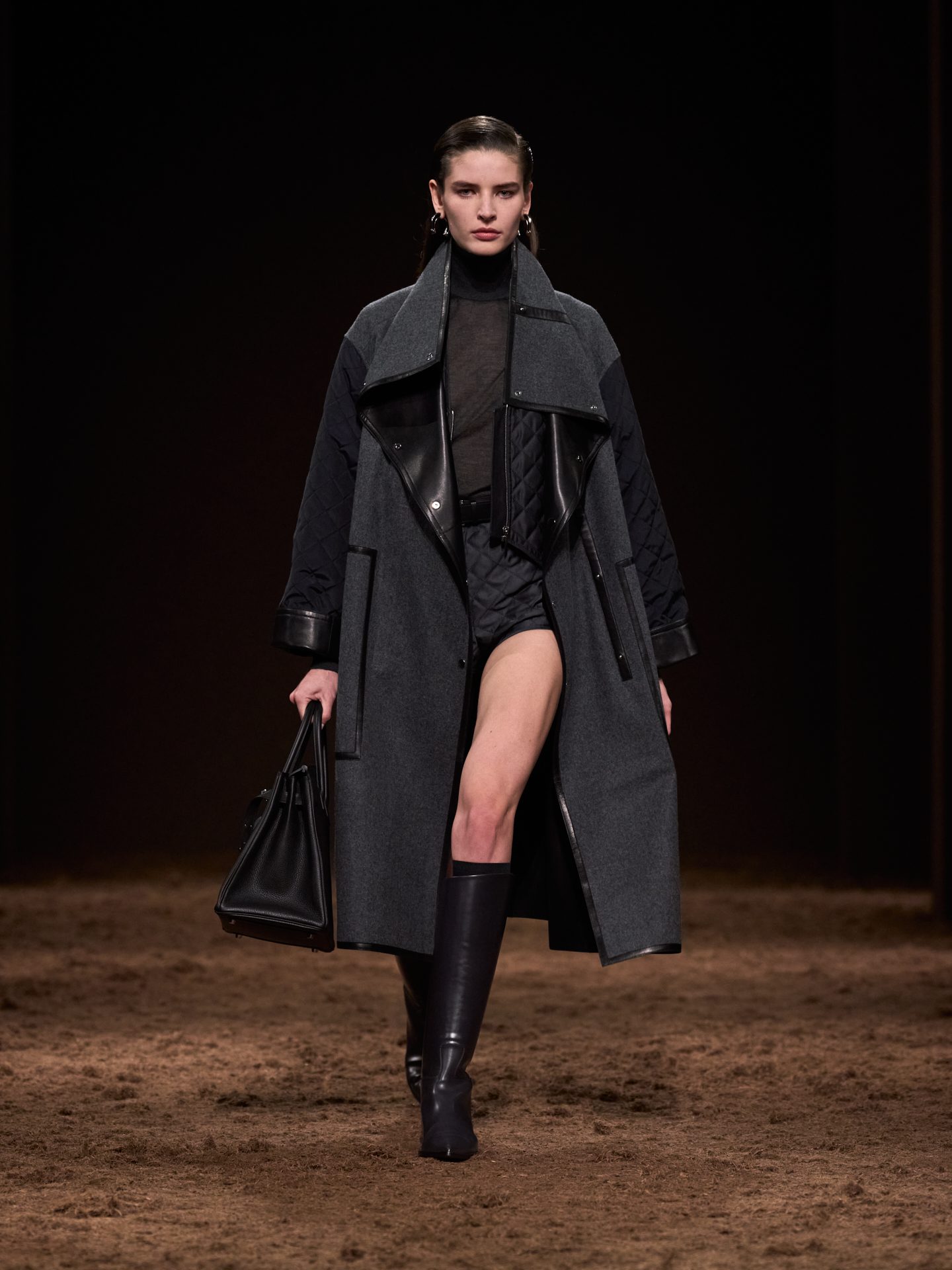 Gilet, giacche matelassè e trench in pelle, tubini in maglia o velluto e look monocolore sfilano alla Paris Fashion Week sulla passerella Autunno/Inverno 2025-2026 di Hermes
