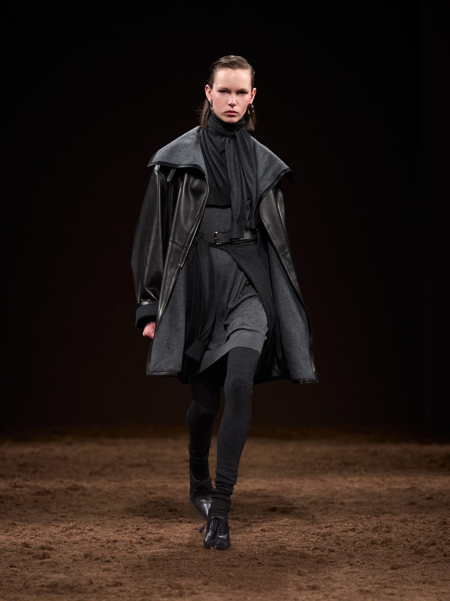 Gilet, giacche matelassè e trench in pelle, tubini in maglia o velluto e look monocolore sfilano alla Paris Fashion Week sulla passerella Autunno/Inverno 2025-2026 di Hermes