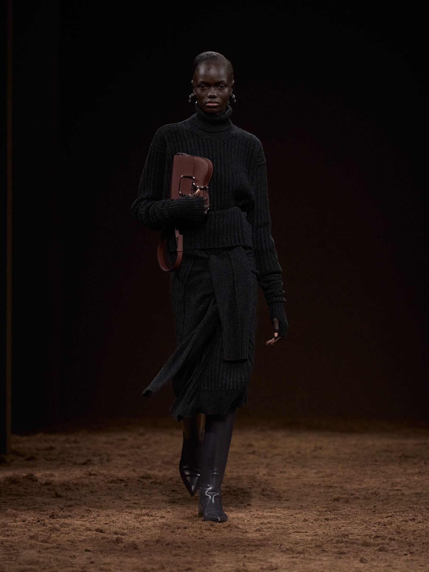 Gilet, giacche matelassè e trench in pelle, tubini in maglia o velluto e look monocolore sfilano alla Paris Fashion Week sulla passerella Autunno/Inverno 2025-2026 di Hermes