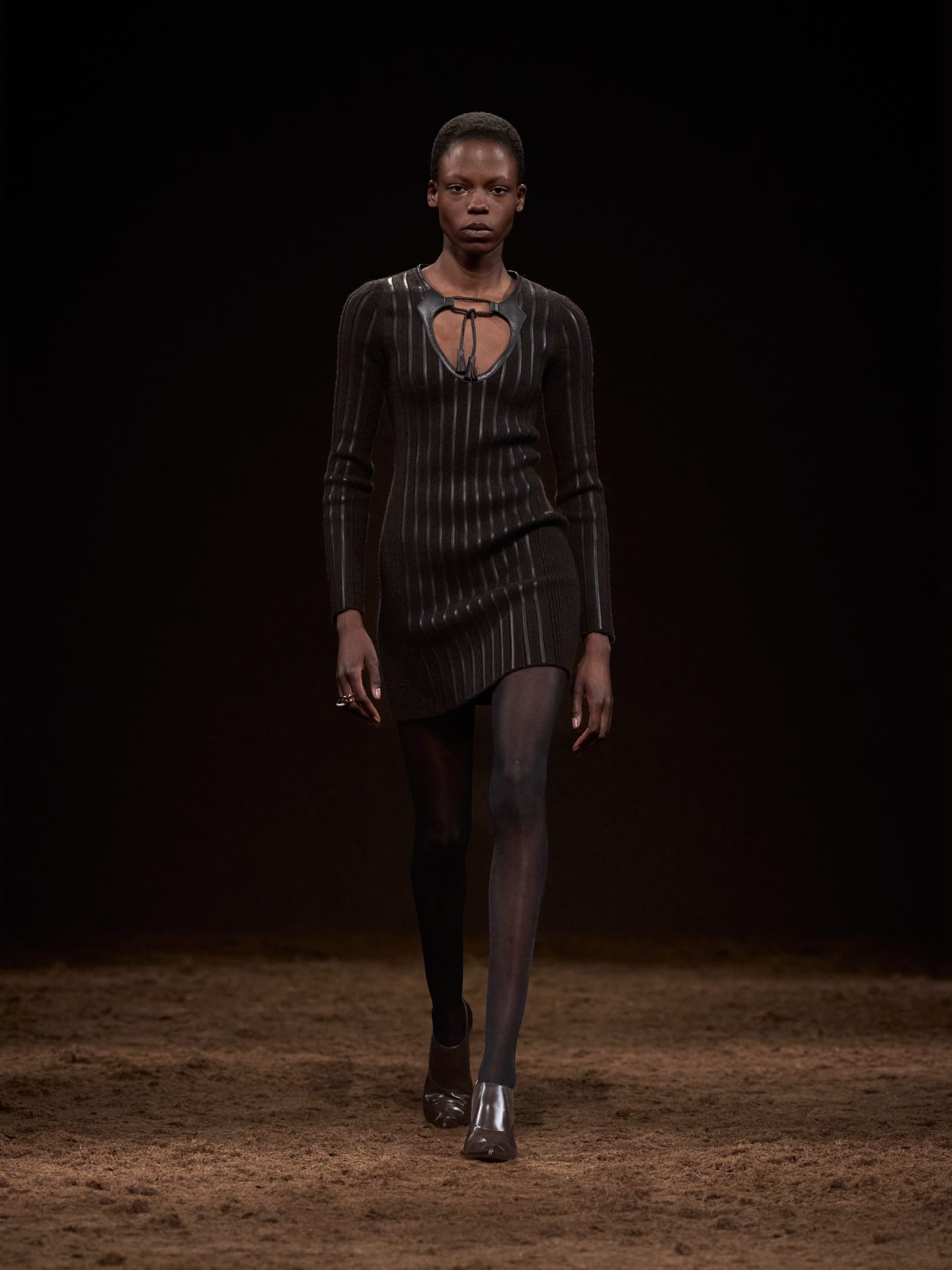 Gilet, giacche matelassè e trench in pelle, tubini in maglia o velluto e look monocolore sfilano alla Paris Fashion Week sulla passerella Autunno/Inverno 2025-2026 di Hermes
